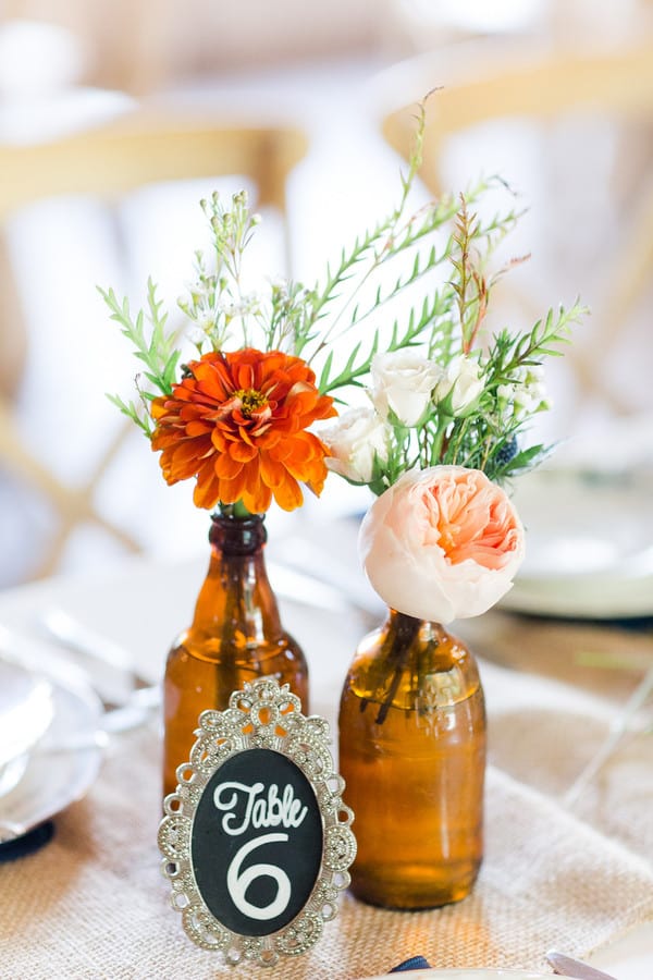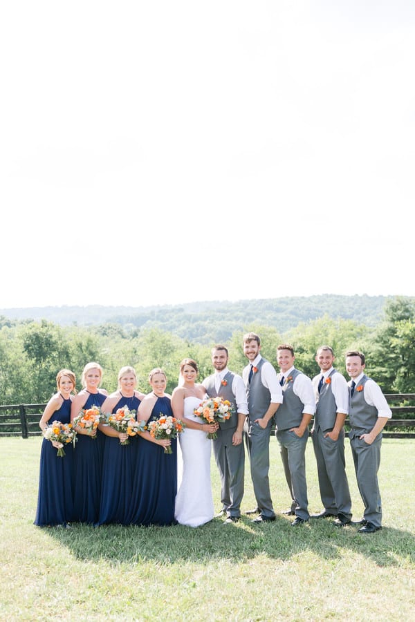 Q1: Tell us about your wedding “When we started brain storming the ‘vision’ we had for our day, the one thing that we knew was that we wanted people to come and have fun! We wanted it to be a unique, laid back, enjoyable celebration surrounded by our friends and family, with some traditional touches included. “We really enjoy participating in outdoor activities together so we knew we wanted an outdoor ceremony. “We also wanted it full of our favorite things! Tacos are Emily’s favorite food so that was what we decided to do for the meal. M&M’s are Michaels favorite candy so we included those with our favors. “With it being summer, we wanted some brighter colors that were complimentary of each other but could also be classic, we decided to go with oranges, blues, and grays. “Emily’s great-uncle is a Reverend who officiated wedding ceremonies for her grandparents, parents, and an aunt and uncle, there was no question when it came to who we wanted to officiate our ceremony. We also loved how our parents were included in our ceremony while we prayed.” Q2: Let’s talk wedding decor “We wanted the decor to be pretty minimal and simple as the venue was gorgeous by itself. Included with our venue were string lights and chandeliers hung from the high ceiling that already gave it a magical feel. “When it came to table shapes and arrangements, we just wanted to do what was going to have the best flow. We used one half of the barn for dinner and the other half for dancing! “For table cloths, we decided to go with a sandy color that accented the natural colors of the wood in the barn and we used navy blue napkins. For the center pieces, I honestly gave our florist the creative freedom to do what she thought would look good (she did NOT disappoint!) She went with orange bud vases filled with a variety of orange flowers complimentary to the bouquets. She also lined the tables with babys breath and on several tables we included lanterns. “Our party favors were the biggest part that was DIY. We filled little glass jars with blue, gray, and white M&M’s and on the tag wrote, ‘Thanks for Celebrating with us! -Love Em and M’” Q3: What were the florals like in your wedding? “Our florals were incredible! Nikki did an amazing job creating everything I could have ever imagined! The first time I cried on our wedding day was when I saw my bouquet. I’m not sure what it was in that moment but seeing the flowers and how they matched my vision exactly, made it all so real. Dahlias are my favorite flower so those were included in the bouquets and center pieces with other orange flowers and some blue accents. We also included a bouquet complimentary to the bridal bouquets tied to each side of the arbor during our ceremony. I do think that they played a pretty big part into the overall style of our wedding. We wanted our main colors to be Navy Blue and Orange and the flowers really brought the orange piece into the day.” Q4: Did you personalize the day in any way? “Yes! We definitely personalized. We chose our wedding date after realizing that out 9 year dating anniversary happened to fall on a Saturday! For our caterer, we used BOMBA Tacos and Rum ( Tacos are a favorite). “We also used Sweet Water Caravan as our mobil bar who served Margaritas (another fav) and Mojitos along with an assortment of beer, wine, and other beverages. “Our DJ, DJ Wolf, was a friend from high school who has very successfully started up his own DJ business. Emily’s great-uncle officiate for us which was so special to have that family connection. “We chose to have our ceremony on the hilltop overlooking a beautiful scenery, which is perfect because we enjoy the outdoors! Some of our favorite parts were the getting ready periods where we got to spend time with some of our closest friends and family in anticipation of whats to come. “We also really enjoyed the ceremony and how meaningful it was to have our parents involved in the prayer. The moments we were able to take away from the crowd just the two of us to take a breather together and soak it all in was great. “And, of course, the first dance was amazing, it felt like it was just the two of us and that is a moment I don’t ever want to forget.” Q5: Let’s talk fashion “After we decided we wanted to get married outside in the middle of August, we wanted traditional but comfortable. “For the guys, we decided to do gray pants, a white shirt and gray vests with navy ties and an orange boutonnière to compliment the bouquets. Michael wore a white tie. We decided not to use the jackets with the exception of photos because of it being a very hot, sunny day! The guys ended up rolling up there sleeves which went well with our more relaxed vision. “Taking into account the weather, I decided I didn’t want a super heavy dress and I knew I wanted lace. After looking at a couple of different shops, Abbotts Bridal had the perfect Casablanca gown and the perfect cathedral veil to go with it! It was an all lace, white gown with a sweetheart neck. “My bridesmaids wore a navy blue flowy dress with a high neckline and a cinch around the waist, they carried orange flowers similar to mine.” Q6: How did you meet? “We actually met when I was 13 and he was 15. I was starting my freshman year of high-school and he was starting his sophomore year. We had a couple of mutual friends and after meeting at a pool, we hit it off and the rest was history. “Somehow, we made it through high school, college and everything in between. We planned a ski trip with some friends to Jay Peak, Vermont in February of 2017. Michael knew that this would be the perfect opportunity to “pop the question.” “He secretly worked really hard with a wedding planner at the resort to schedule the perfect proposal. He scheduled a private tram ride for our group on the Saturday that we were there. He then created an email to make it seem like because he was a returning 