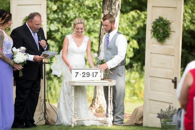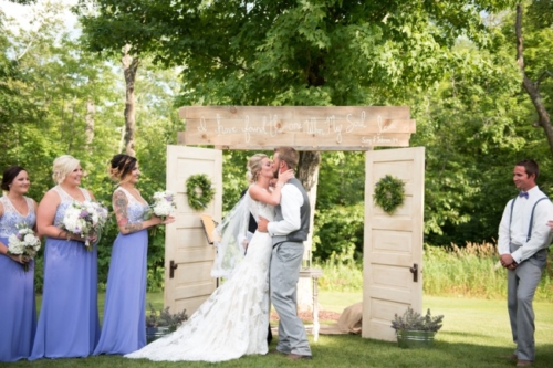 Photographer’s Comments: “Kaleb and Emma were married on July 29, 2017 at BWB Ranch in . They had a beautiful outdoor ceremony adorned with vintage touches, a hand made double door backdrop and both adult and children beverages available as the guests arrived. “The reception was in a beautiful barn constructed from the wood of an old local train bridge, with the first dance under the chandelier in the opening of the barn.”Gallery