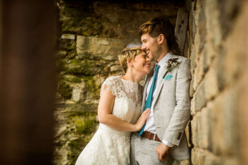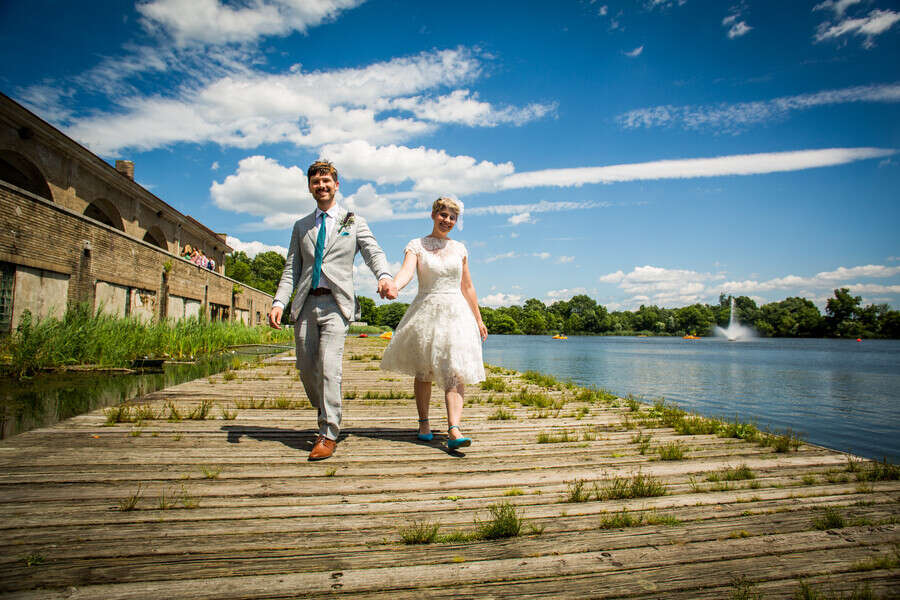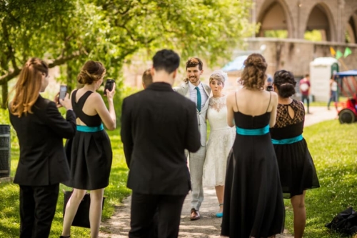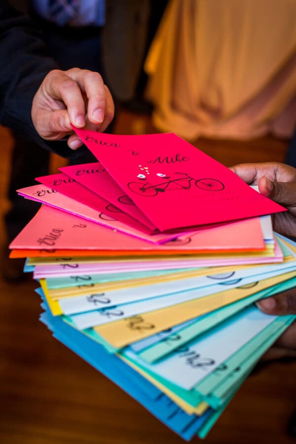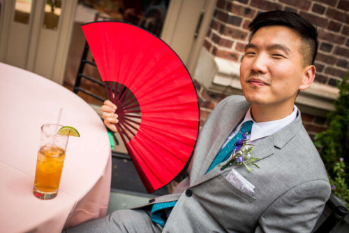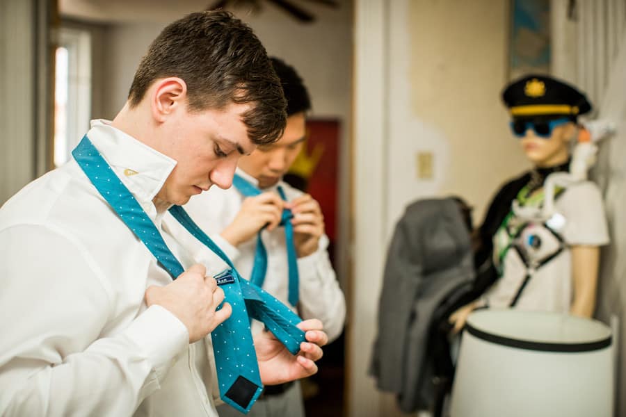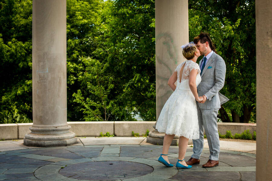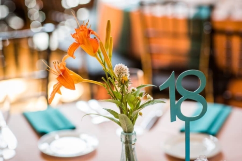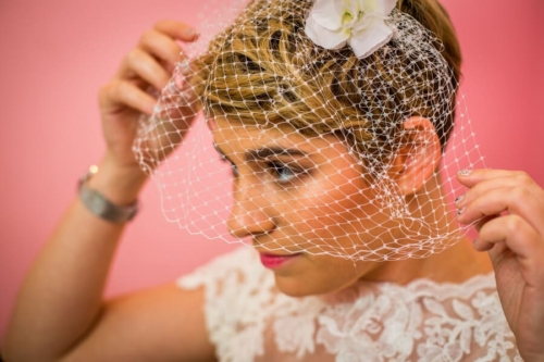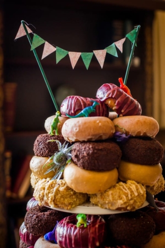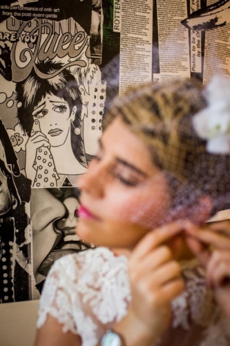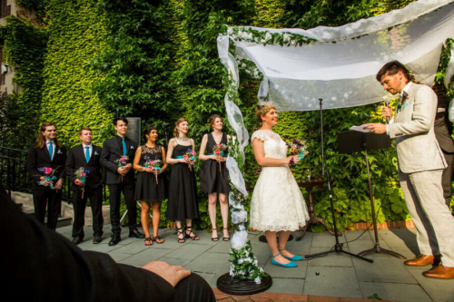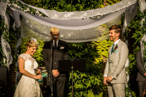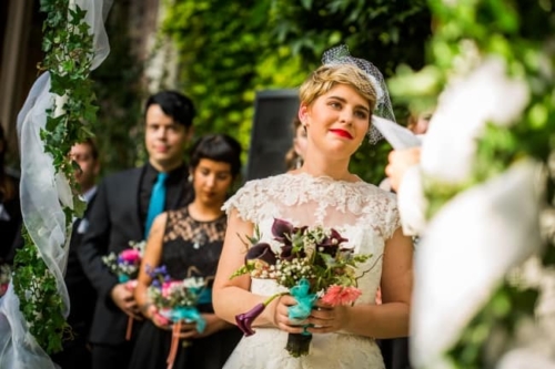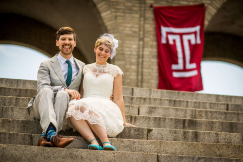 Q1: Tell us about your wedding! “We wanted our wedding to be very personal. We had been to weddings in the past where the couple getting married had made all of the choices themselves, and it felt very personal and real. Conversely, we had also been to weddings that felt bland, where you couldn’t tell much about the couple from the ceremony or reception. We wanted something that was unequivocally ours. “The idea of a theme seemed a bit overwhelming after doing some thought. We had originally thought of having a 50’s themed wedding, but we ended up mixing elements from Erica’s Jewish culture and our shared love of punk and surf music. “We used some elements of traditional Jewish wedding ceremonies, such as the Chuppah, symbolizing the home that we are building together, the hora, and breaking the glass. However, our ceremony was legally a quaker ceremony, and we tried to incorporate some quaker traditions, such as having our guests share in the ceremony and recite vows with us. “We chose peach and turquoise as our main color palette, and matched the bridal party ties to our tablecloths and napkins. Flowers loosely followed this palette as well, but more on that later. Q2: Let’s talk wedding decor “Most of our decor was done by ourselves or our friends. We were lucky in that the space that we got married in was beautiful already without any decorations. “The Chuppah was originally made by friends of Erica’s parents for their son’s wedding. They loaned it to us, and we bought some sheer cloth to spruce it up a bit. We had a trial run of putting it together, and ended up having Erica’s uncle and father put it together on the day of in the medicinal garden that we were married in. “We decided to have a small ceremonial cake, so that we could cut something, and also a large donut tower style cake from our favorite donut place in Philadelphia, Federal Donuts. We topped the donuts with miniature bunting that Erica painstakingly made in the week leading up to the wedding. We also topped it with plastic dinosaurs. Mike had the idea to add plastic dinosaurs to the donut tower while driving up the New Jersey turnpike the weekend before the wedding. Considering how much thought we put into everything, this was probably the only detail that had no forethought. “Friends of ours who could not make it to the wedding mailed us a large inflatable cat with the request that we set it up in their stead at our wedding. “Erica really loves Halloween, and she imparted that love onto Mike, and we really wanted to see that represented in our celebration. This was a great way to tie that interest in.” Q3: What were the florals like in your wedding? “Our friend Jess Monte has been working with flowers for a long time, in academic and professional settings. When we told her that we were getting married, she immediately offered to arrange flowers for us. They were grown at One Flew Over Farm, in Mays Landing, NJ. “Jess worked with the farm to curate a mix of plants and flowers featuring calla lilies in boutonnières, bouquets and centerpieces. The selection of plants and flowers perfectly matched the marriage of our joyous celebration and the macabre ambience of our chosen venue, which is a medical oddities museum.” Q4: Did you personalize the day in any way? “We sure did! “We had a lot of activities for our guests to enjoy at the wedding. In particular, the band we chose was very important to us. Our first date was a West Philadelphia Orchestra show, where we danced together for the first time. “We were able to have them play at our wedding, with both traditional slavic and klezmer tunes, a 30 minute hora set (that our family and friends still talk about!), and some 60’s era surf music. They even played our first dance, which was ‘Do You Wanna Dance’, and was played in the style of the Ramones with a splash of klezmer in the form of a horn solo. “We took dancing lessons leading up to our wedding and surprised everyone with a swing dance for our first dance. We really enjoyed dancing at our wedding and we think that many of our guests did as well. There was even a circle pit! “We also set out temporary tattoos and postcards with stamps for all of our wedding guests. They were both a huge hit! Mike writes and mails many postcards on a regular basis, and had been collecting postcards for years. He decided to bring his postcard collection to the wedding and have the guests write messages to us, or to anyone else! “As a gift, Mike’s parents bought a large untreated slab of wood, which they brought to the wedding to have guests sign. Afterwards, they brought it to their house, varnished the wood several times, and built it into a bench to be placed into our backyard.” Q5: Let’s talk fashion “Erica originally bought an off-white dress from a vintage shop. When she showed it to her mom, her mom was upset that she wasn’t involved in choosing the dress. Erica humored her mom and went with her to another dress shop and ended up getting a great deal on a dress right off the rack. It fit her perfectly, and did not require any adjustments. Erica never wears white and could not have pictured herself in a traditional long, flowing dress. The dress she chose suited her style well and was a great choice for dancing. She wore turquoise flats for the ceremony and changed into white doc martens before the first dance. “She wore a short birdcage veil. “After much research on wedding hairstyles for women with short hair, she decided to style it herself, and focus more on getting her makeup professionally done which proved to be a great decision. “After much thought and research, Mike chose a light grey suit with a checkered pattern. Erica and Mike did some brainstorming and decided that Mike’s party would wear grey suits without a pattern and Erica’s party would wear black. “Rather than choosing a specific dress or suit for the wedding party to purchase, we dec