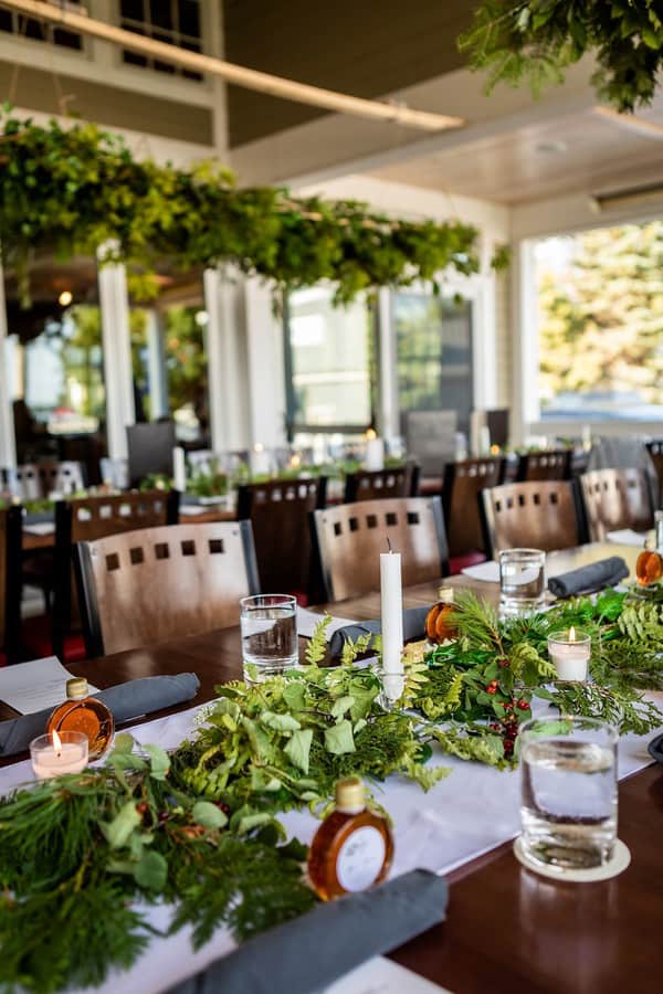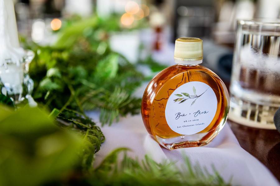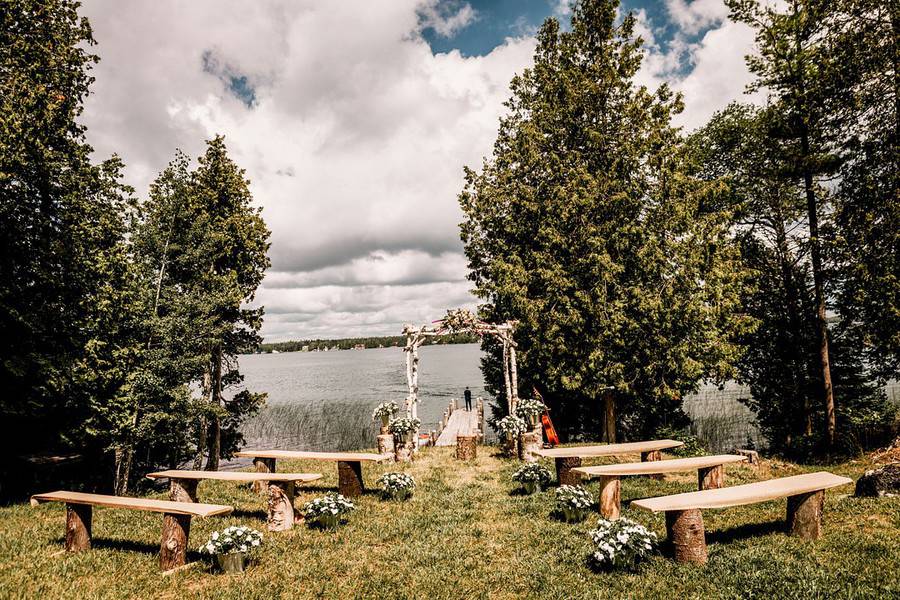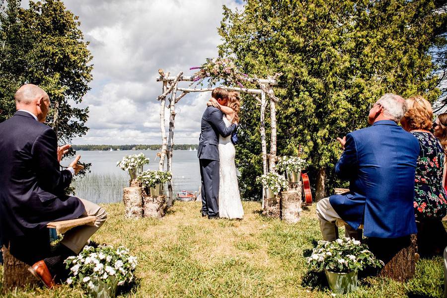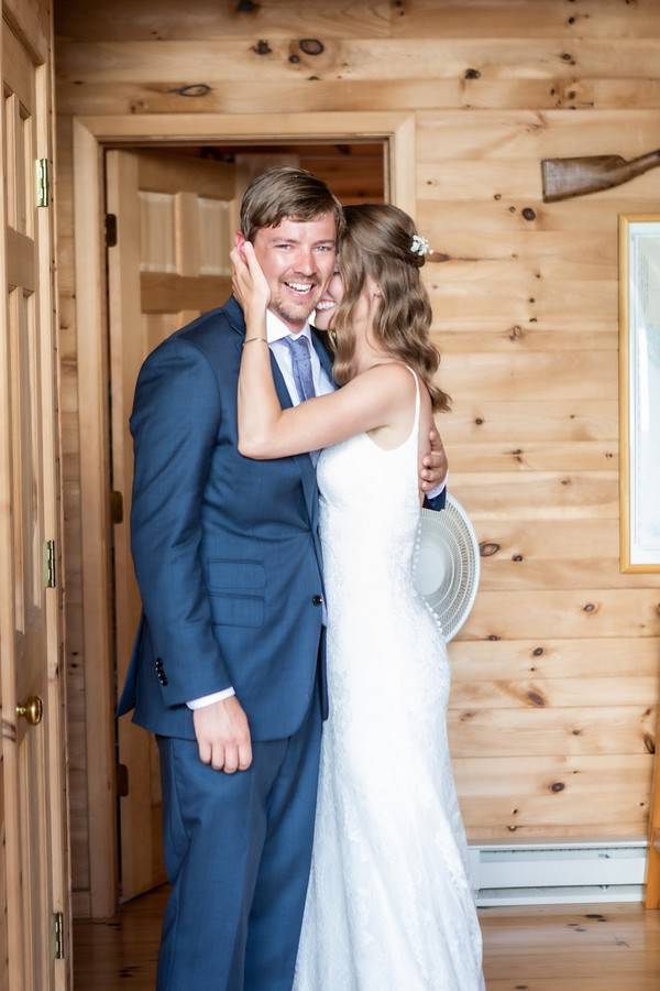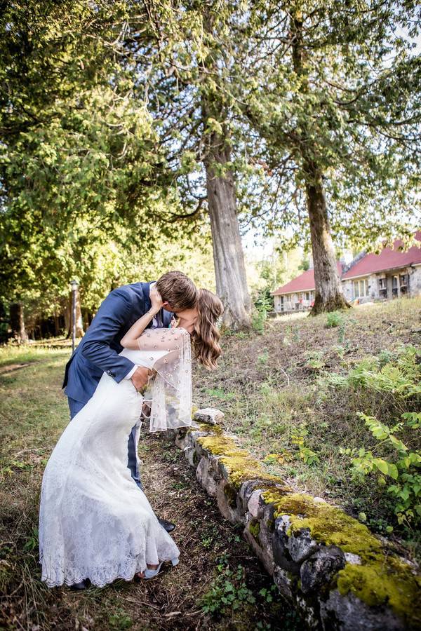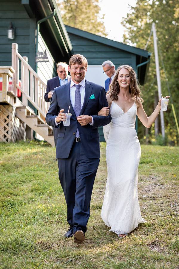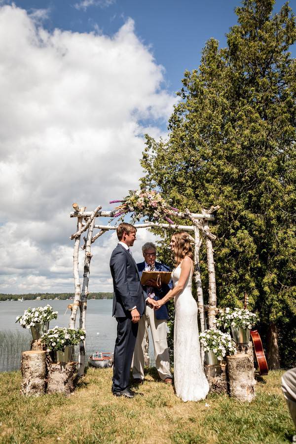 Photographer’s Comments: “From boat rides, to birch arbors, to beautiful DIY details, Erin and Ben wanted their wedding to fit seamlessly into the beauty of the Les Cheneaux Islands of Northern Michigan. “The 40 guests arrived at Erin’s family’s summer house in the Les Cheneaux Islands by all manner of watercraft – wooden boats, speedboats, and pontoon boats. For the waterfront ceremony overlooking the channel, they were seated on wooden benches created by Erin’s dad and Ben to witness Erin and Ben exchange vows under a handmade birch arbor crafted from trees on the property. For the ceremony, the officiant, a dear friend of theirs, created a wooden book from a piece of driftwood that their dog had dropped at his feet during his first visit to the property. “Family and historical connections continued throughout each aspect of the day. Ben’s grandmother had passed away shortly after they were engaged, so he used a piece of the dress she had intended to wear as a pocket square in his suit. Erin took pieces of several of her relatives’ wedding dresses and wove them together as a braid on her bouquet. Pictures of their grandparents rested atop handmade birch tables. After the ceremony Erin and Ben set off in a classic wooden speedboat sporting a “Just Married” banner to visit the historic cottage that has been in her family for over a hundred years. “The gorgeous tablescapes and vibrant local food from the Les Cheneaux Culinary School showcased the bounty of the region. For cocktail hour, guests enjoyed two signature cocktails named after the couple’s dogs Rowan and Bowie. Guests took home a small bottle of local maple syrup – a nod to the couple’s first fight during which a bottle of maple syrup spilled all over the wall that they had just finished painting in their house. “An effortlessly beautiful bride, pristine natural surroundings of woods and water, and the many rustic yet elegant DIY details made this wedding stand apart for me. Not only does each aspect of this wedding have a story, the love between Ben and Erin and the joyful ease with which they and their guests approached the day made this wedding a dream to shoot.”