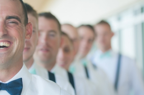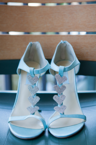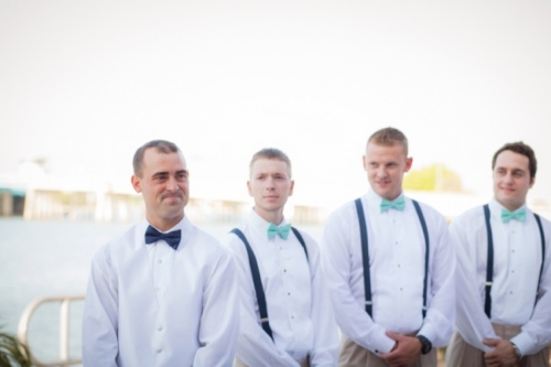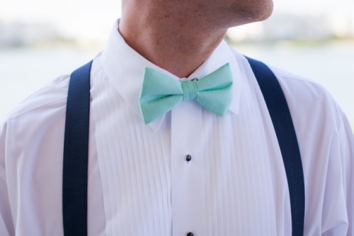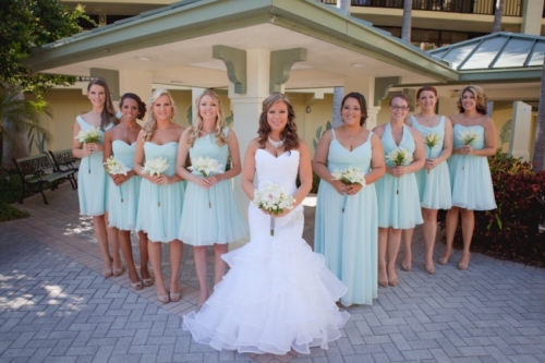 “My bridesmaids all wore mint colored Angelina Faccenda by Mori Lee dresses. The color and fabrics were all the same but each bridesmaid wore a different style based on their body type and what they felt comfortable in. My maid of honor wore a long dress, where the others were all in shorter styles. I chose to tie it all together with matching shoes, which were nude peep toe sling backs and matching nautical jewelry.”
