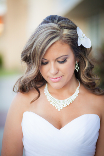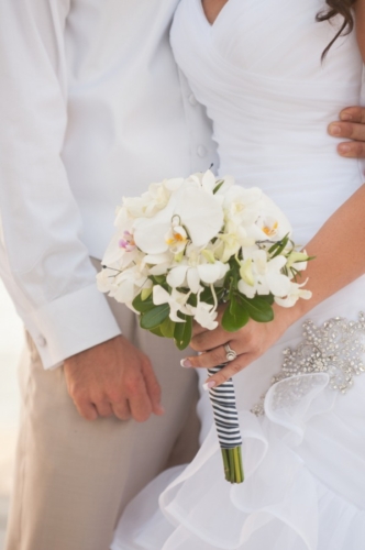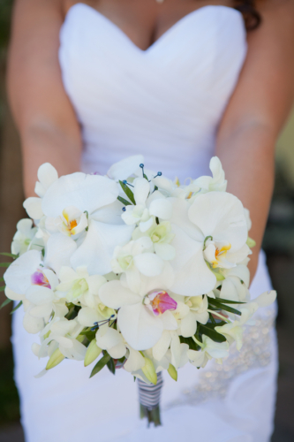 “My bridesmaids bouquets were three single white lilies, and my was an arrangement of different types of orchids.”