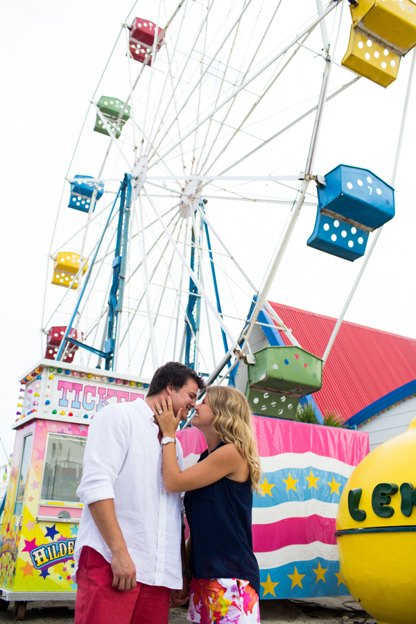 We have witnessed many great engagement shoots this year with eye-catching backdrops and props. I think the ones that stand out the most for me, are engagement sessions that take place at the carnival! Remember the Dapper Day Inspired Engagement Shoot back in July?  It’s probably one of my favs, with today’s session following close behind.A day at the country fair brings back good memories – a hot summer day on a first date, where you are nervous, shy, and on your best behavior.  But by the end of the date, you have both filled up on snow cones and sugary donuts.  You have warmed up to each other, laughed, and gone on lots of fun rides. Okay, perhaps the fair isn’t where you had a first date, nonetheless, it definitely is a date-worthy destination.Clearly, from these photos, the fair (Ocean Drive Pavilion Amusement Park) is an even better back drop for an engagement shoot!Craig and Lindsey met on December 27, 2007 at a holiday gathering at a mutual friend’s house. Shortly after Lindsey and Craig met in December, he enrolled at Mount Olive College, while Lindsey was a senior at East Rowan. Through the years to come and establish their careers, they continued to hold a place for the other in each other’s heart.On March 14, 2014 Craig asked Lindsey to spend her life with him in Lindsey’s kitchen while she was covered in Cool-Whip from a Pi Day event at her school.