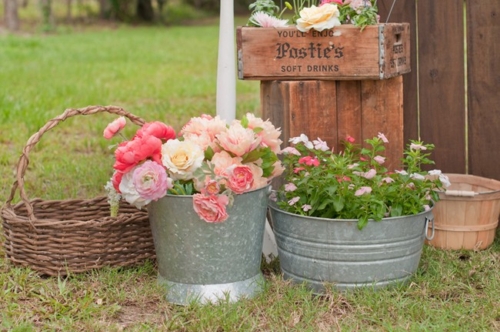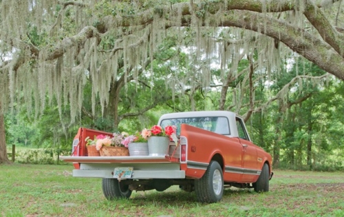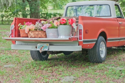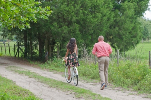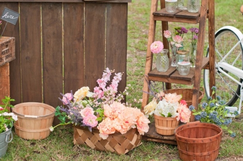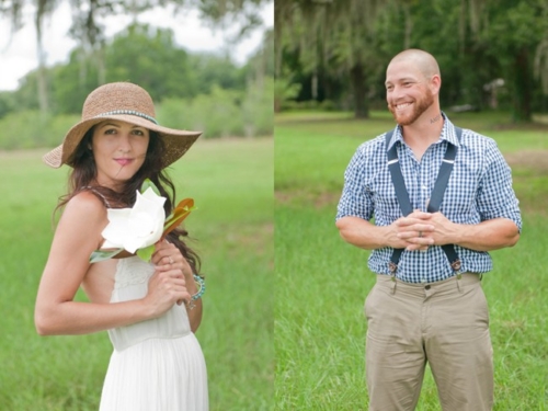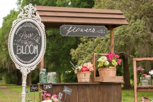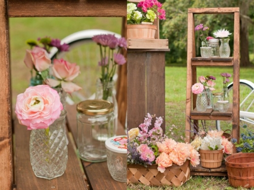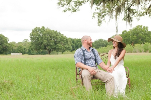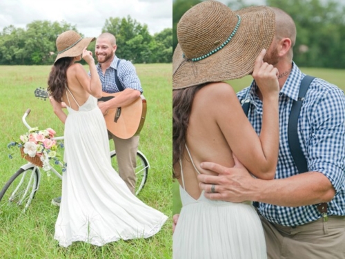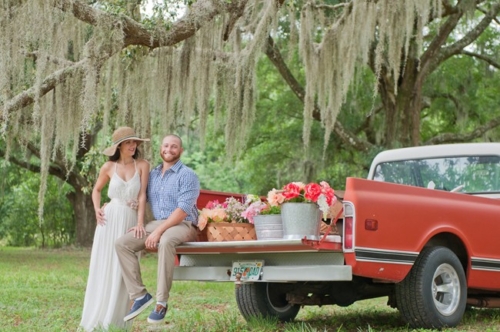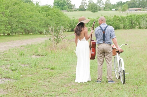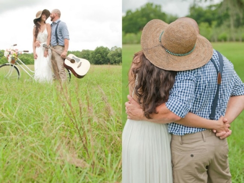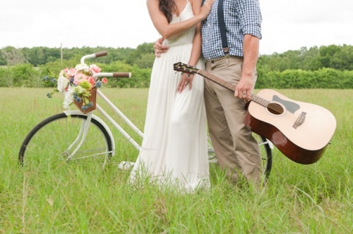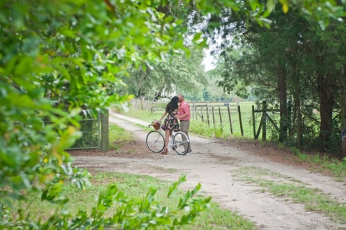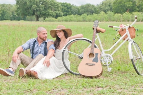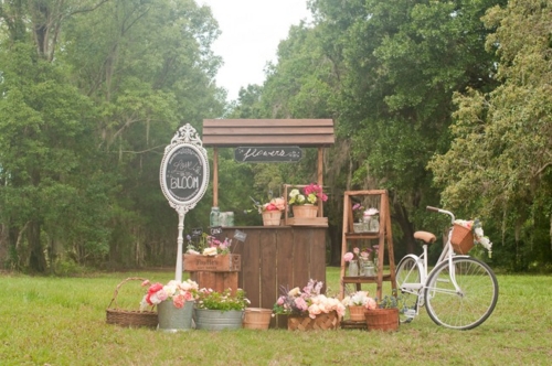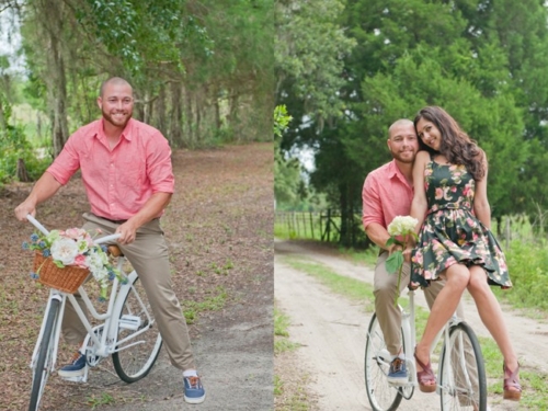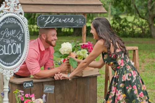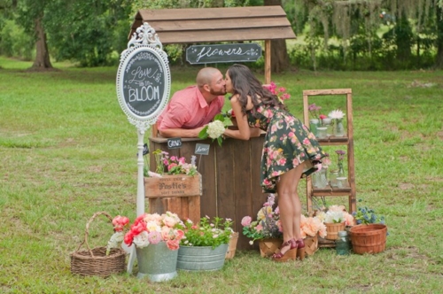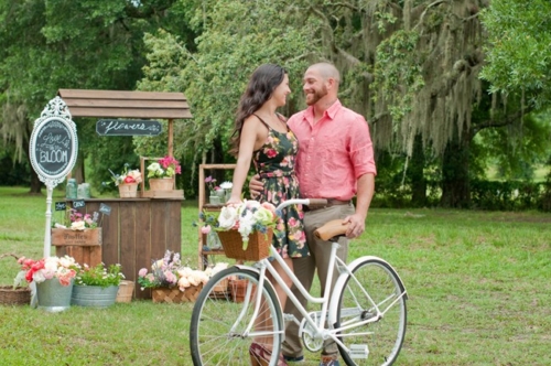 We made it through Friday the 13th, the full moon, Father’s Day and the most popular wedding day of the year or so I have been informed.  According to the registry at David’s Bridal, 26,370 couples were expected to walk down the aisle this past Saturday June 14th.  I just love seeing eye-catching, unique decor details and props within weddings and engagement shoots.  Today’s photographer, Artful Adventures Photography, is all about styling a photo shoot. I flipped when I saw this super cute flower stand engagement shoot. Photographer’s Comments: “From the moment I met Alexandra and Brandon, I knew how much fun working with this sweet couple would be. Alexandra was drawn to me by my creative love for vintage, rustic, and southern styled photography. As we sat discussing the wedding and engagement it was fun to watch the spirit between the two. “I style almost all my engagement shoots. Styling is the fuel that ignites my passion for photography. In meeting each couple I like to collect bits and pieces of information that helps me create a theme that is meaningful to the couple. “In our conversation I gathered Alexandra loved color and was not set on color palettes, but rather loved all colorful things. She explained she is not setting color limitations on her bridesmaids and would like to have a wedding full of an array of different hues. “She mentioned how she and Brandon enjoyed riding bikes together. They enjoy vintage things, but expressed how she would love something a little different from the typical picnic theme. I came up with the idea of a flower stand. It’s colorful, and not something I have seen much of.” “I found a cheap old bike and removed all of the cables and reflectors and painted it white using good old fashioned spray paint. My husband built a flower stand and plant stand for me out of rough cut wood. The baskets where purchased for about a dollar each at local thrift shops. The glass jars and vases were from my own collection, and some were purchased from local thrift shops. Other props such as pails, vintage mason jars, and crates where used from my own collection of items. I wanted the session to have a small town southern country feel. The property at the Ever After Barn was perfect. The location offered both wooded areas with beautiful flowing moss, and open field with tall grass and magnolia trees. I could not be more touched to see the surprise on Alexandra and Brandon’s face when they saw everything. That is what it is all about and makes every moment worth it!”