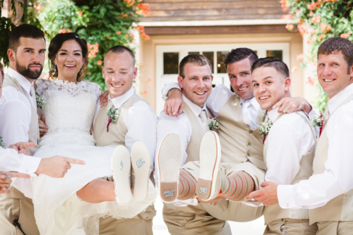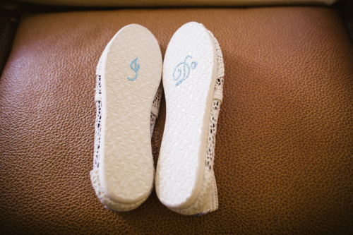 “Skelly wore a tan suit, minus the jacket. So tan pants, a white button up shirt, a tan vest, and a white tie. We found this at Men’s Warehouse. The only part Skelly cared about was the shoes! He loves Toms, so he and all the groomsmen wore them. He found himself a pair of tan leather Toms that were a little fancier than the traditional canvas Toms.”