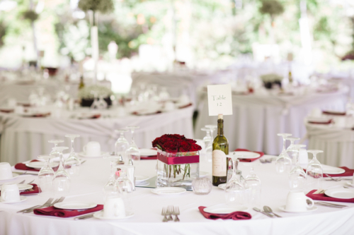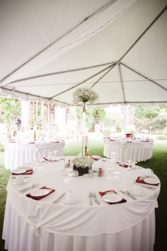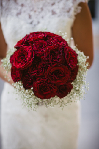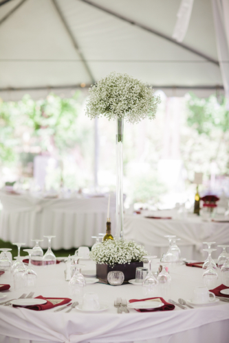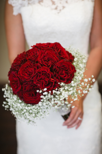 “Flowers weren’t something we wanted to spend lots of money on. We had baby’s breath for the bridesmaids bouquets and for the guys. half of the center pieces were tall thin vases with a large bundle of baby’s breath at the top. The brides bouquet was burgundy roses surrounded by baby’s breath. The other half of the centerpieces were short cases filled with burgundy roses.”
