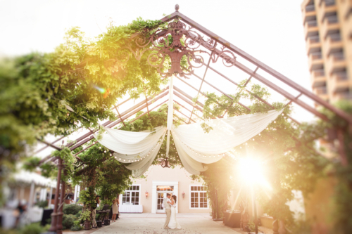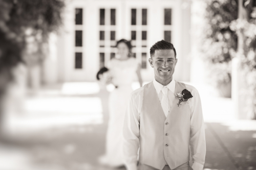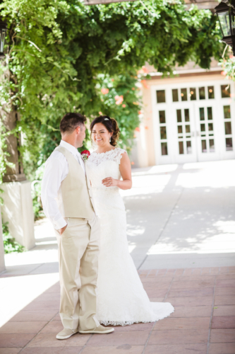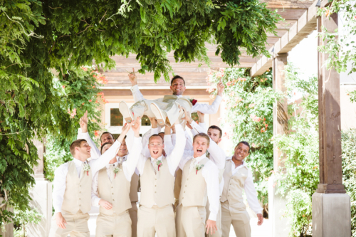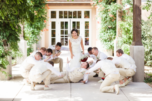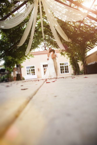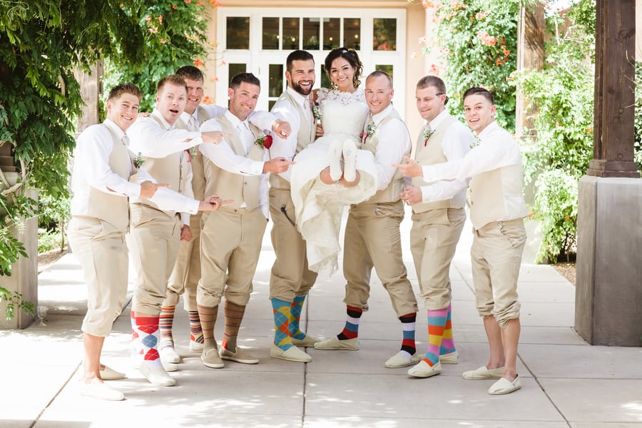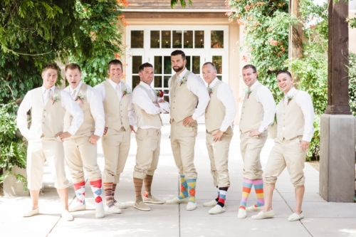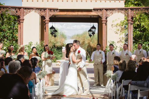 Remarks from the photographer: “Brittney and Skelly like to have fun and their whole wedding party did a great job of contributing to their outdoor wedding at Hotel Albuquerque. The color palette may have been taupe and white, but they used pops of color to express themselves in a fantastic way. They started out their wedding with a first look and the love continued to flow from there as they danced and grooved their way into the reception.”