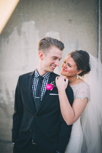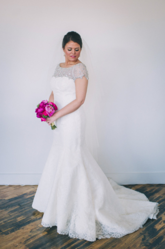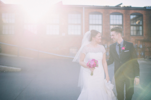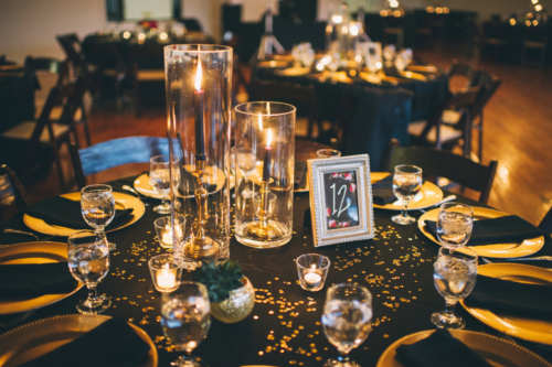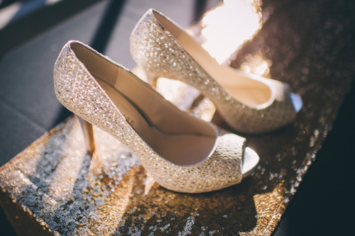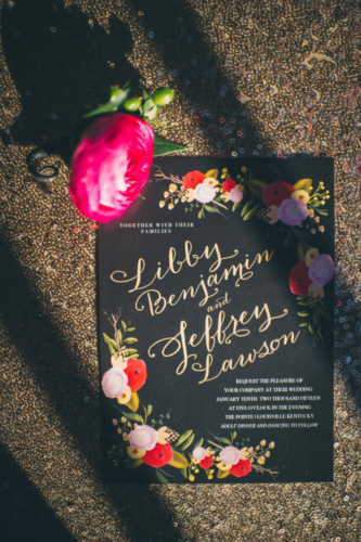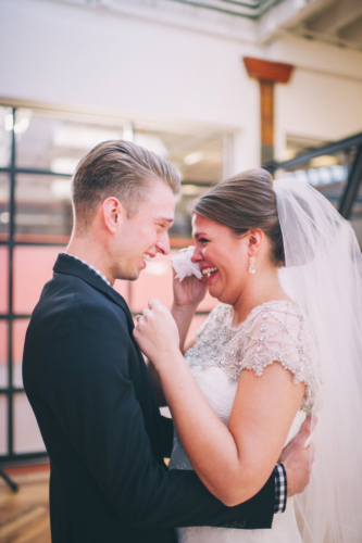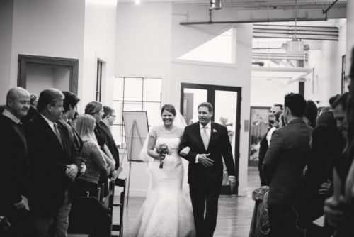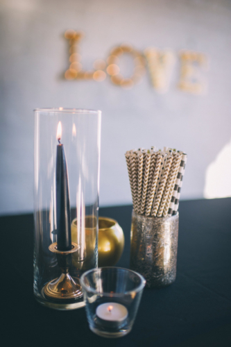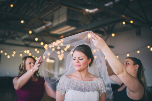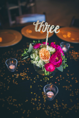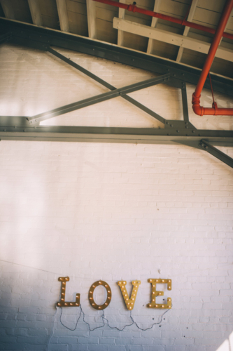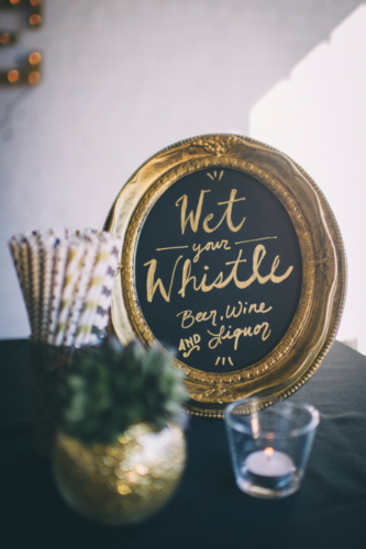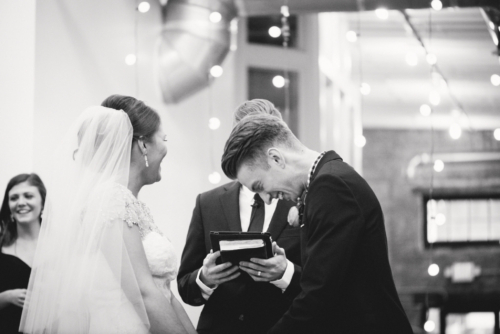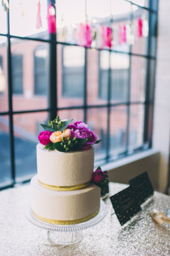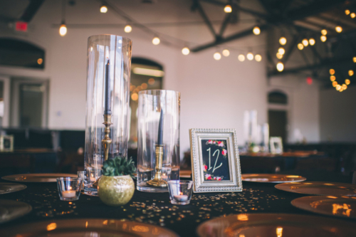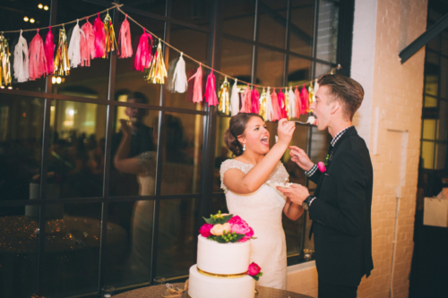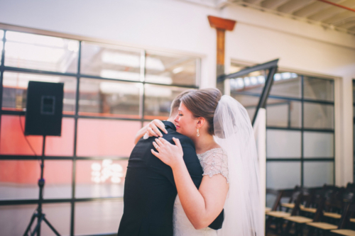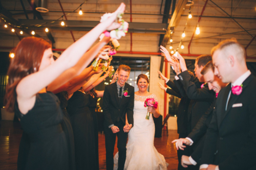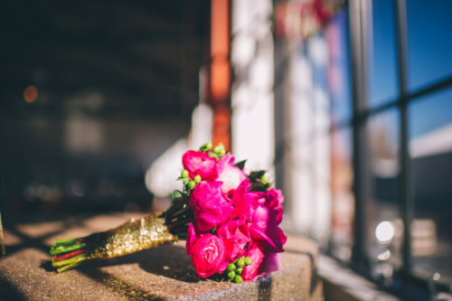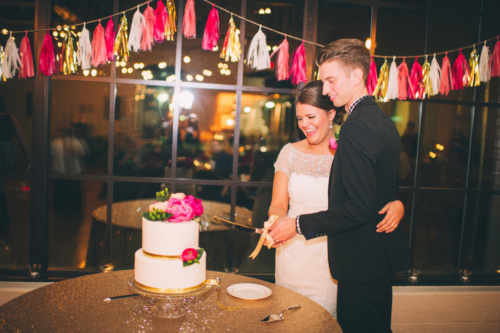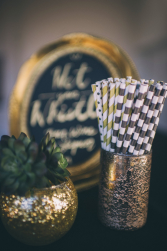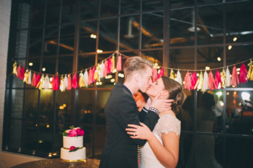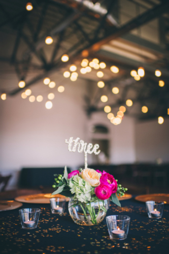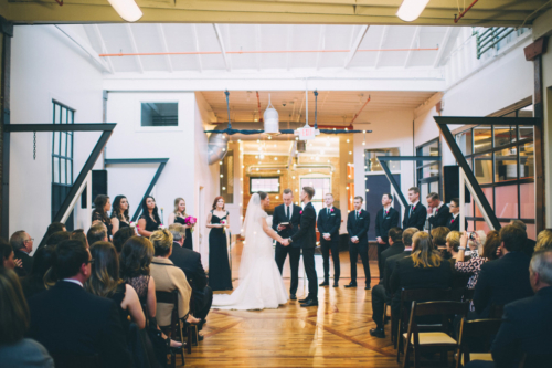 Today’s gold and glitter wedding at The Pointe in Louisville, Kentucky has fabulous written all over it. We love the look and are fans of the ‘industrial brick’ wedding ceremony/reception look. The juxtaposition of cold steel and brick walls against white and black dresses, gold accents, and colorful streamers works well.