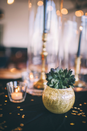 Gold sequined centerpiece arrangements with succulents – simple and very DIY friendly.