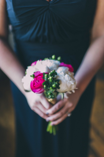 The bride’s choice of colorful bouquets to go with her black/white outfits has a wonderful appeal.