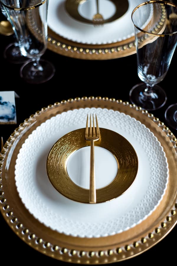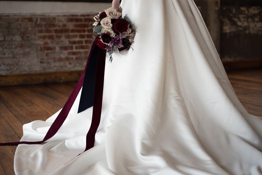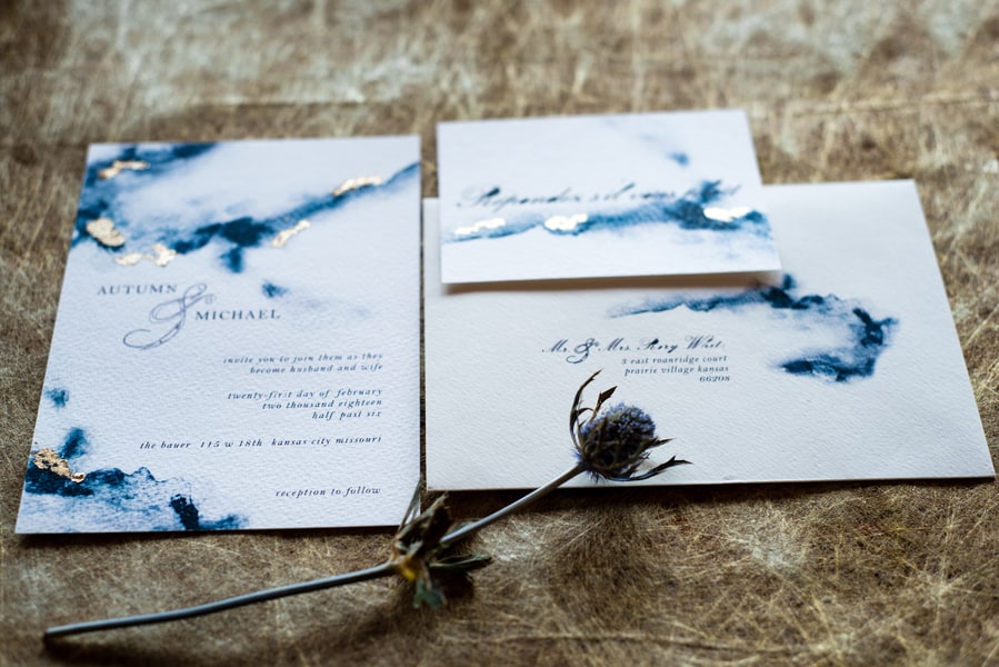 Photographer’s Remarks: “Sumptuous tones of gold, burgundy, and navy were the order of this beautifully crafted day. With its exposed brick and distressed walls the urban chic setting of The Bauer in Downtown Kansas City was the perfect backdrop to enhance the elements of the theme and tie them together. “Incredible place settings and decor items provided by UltraPom Event Rentals were set off by the expert floral arrangement of designer Jennifer Stence of ShyMyrtle Floral Design and the incredibly elegant paper goods designed and printed by Chrissy Taylor of Sugarbean Paper Co. “Kansas City jewelry company, Coki Bijoux, added extra sparkle to the day with a stunning aquamarine ring for the bride and a 3-D printed steel ring for the groom as well as all other jewelry pieces featured in the shoot. “The Annabel gown created by Modeca was loaned to us by the beautifully curated Something White Bridal Boutique along with the cathedral length veil. “Cake bars from Ticklebelly Bakery with edible gold leaf rounded out the day with just a touch of sweetness.”Gallery