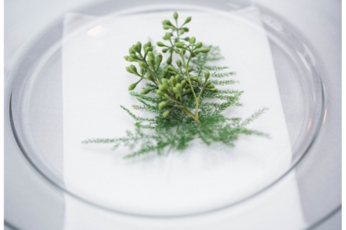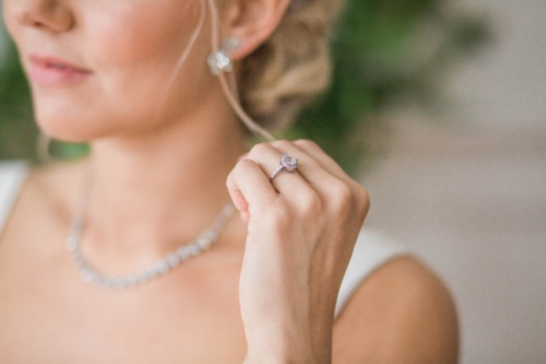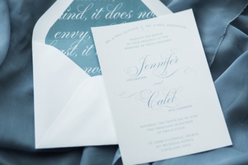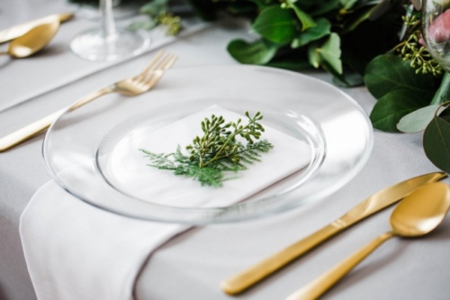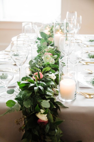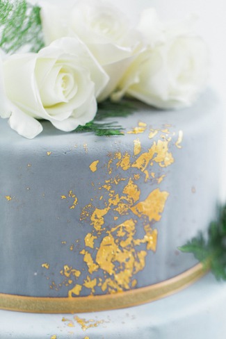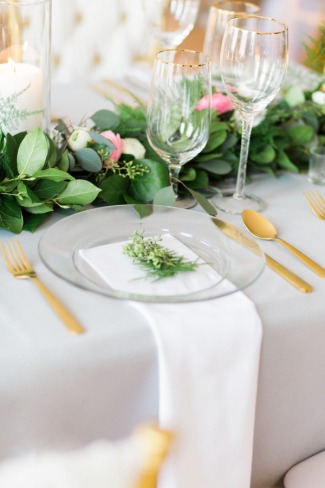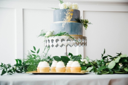“Blue and green, there’s something calming and serene about those two colors and it’s the backbone to our styled shoot. When Dessa Event Planning and I came up with the concept of our spring styled shoot we wanted to create a look where minimal natural foliage met the soft hues of grey and dusty blue.” The Venue “The shoot was held at an airy loft in the city of Batavia just 45 minutes north of Downtown Chicago. The natural wooden floors and large windows gave us a great blank canvas to work with.” The Decor “A delicate handmade foliage garland with Italian Ruscus, Seeded Eucalyptus, Lemon Leaf, and blush garden roses graced the center of the table. The cake was another highlight of the shoot hand painted by Sweet Temptations Bakery to replicate marble.” The Fashion “The bride wore two dresses: first, a flowy semi-sheer white dress accentuated with a high slit. For the second dress we really wanted a gown that was unique, but still bridal. More often now than ever we see brides opting for a non-traditional dress whether it be a different color or unique texture. The second gown supplied by The Frock Shop was the perfect shade of dusty blue with a see-through beaded corset bodice. This gown was originally intended for a prom type event, but accessorizing it with a matching veil makes this look delicate and remarkable.” “All the vendors that participated in this shoot really understood the concept we were going for and helped create an inspiration for brides searching for a soft and natural look.”