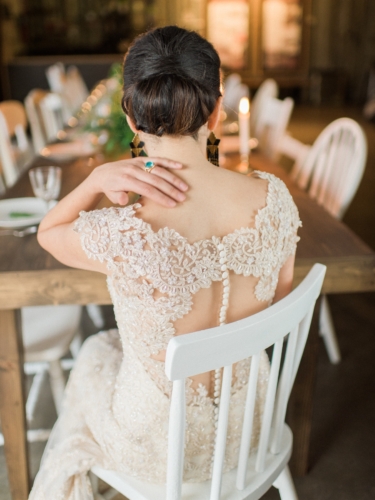 “And if these two things are amazing on their own, how spectacular must they be together?!! Well, judge for yourself, but we loved the unique combination of this wedding inspiration. It proves that winery weddings don’t have to be outdoor country chic — they can be bold, insanely elegant, and even industrial if you want it to be. Everything from the extra long farmhouse tables and the simple gold foil cake to the spectacularly beaded lace gown and custom earrings told a story.”