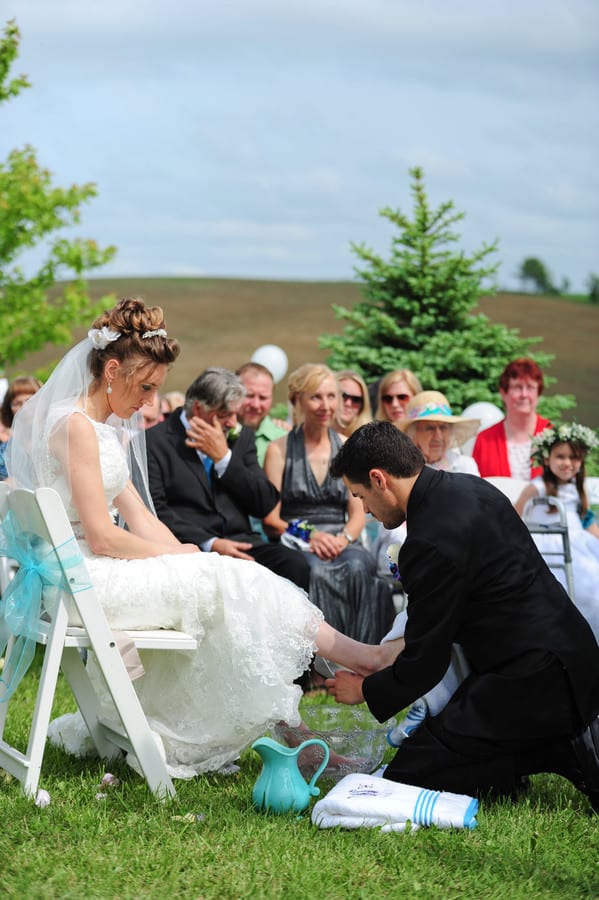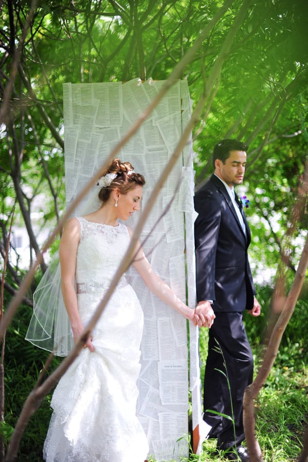 Photographer’s Comments: “Holly & Sebastian got married at her parent’s farm backyard in Eau Claire, Wisconsin. They shared a ‘First Look’ without actually seeing each other, but around DIY doors covered in Bible pages, which were also used as her ceremony entrance, so romantic! “The iron archway (with the Beloved sign) they stood before was also created by the bride’s father. During the ceremony they gave roses to their parents, had communion & a touching foot-washing ceremony for each other, and shared their FIRST EVER KISS! What a grand, amazing love Holly & Sebastian have, and what a beautiful, unique wedding day.”