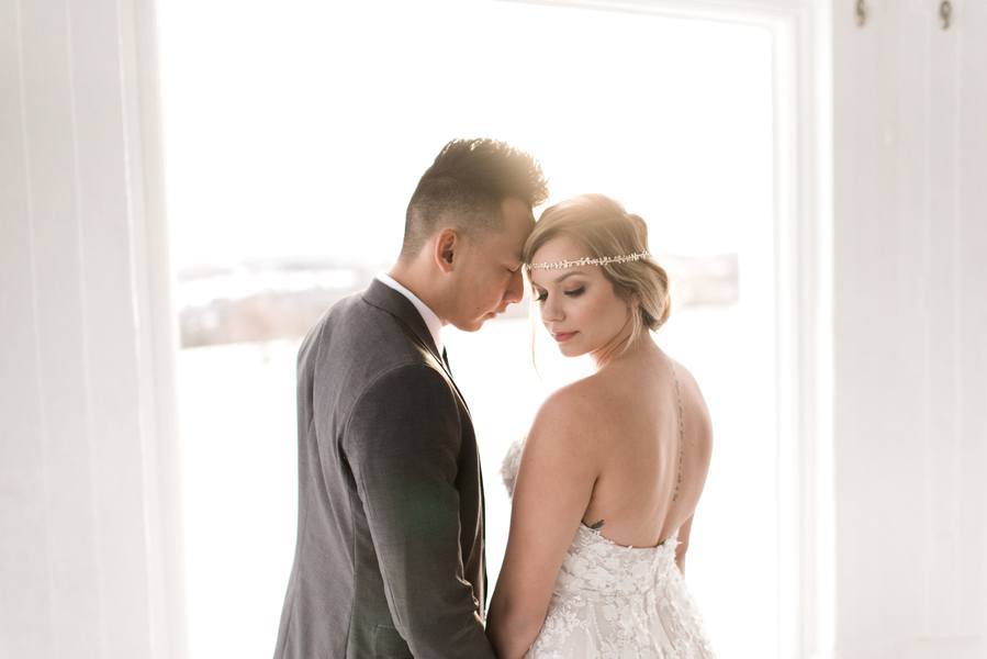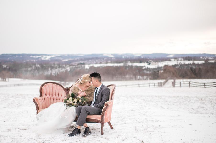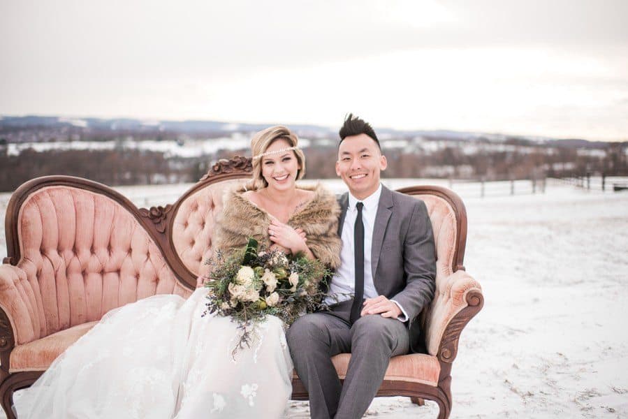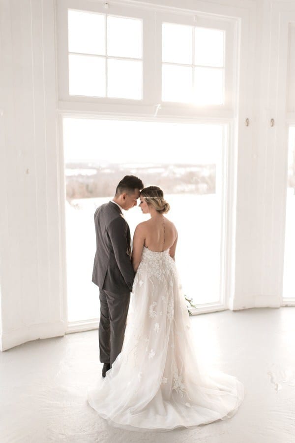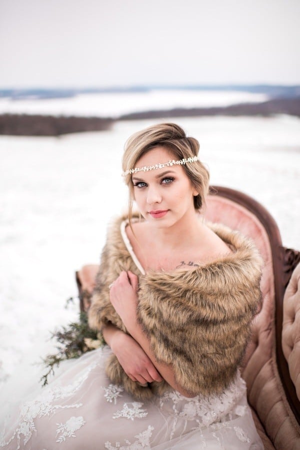 Photographer’s Remarks: “With just a few hours left of light we got some seriously dreamy images of these gorgeous human beings on top of a mountain beside the river on a below freezing day with a wind chill and a winter storm coming in. The delicate details of the 3D flowers on the dress to the Game of Thrones styled headpiece made for some seriously dreamy and romantic winter wedding inspiration.”Gallery