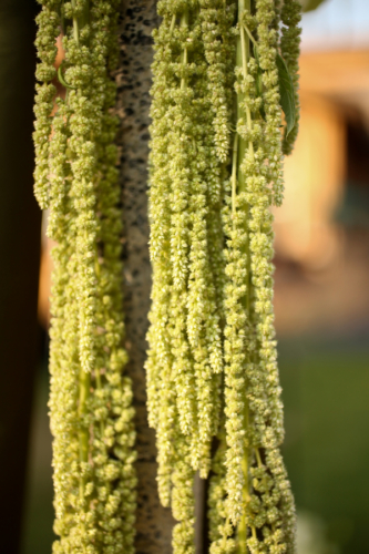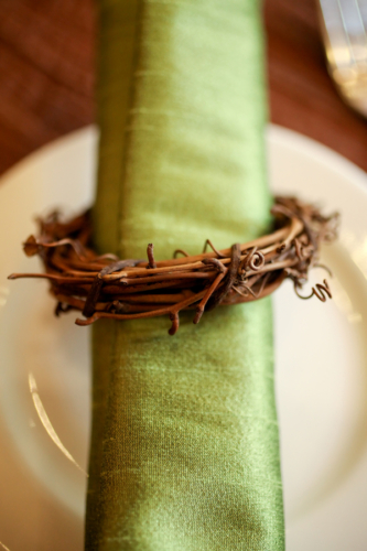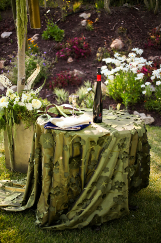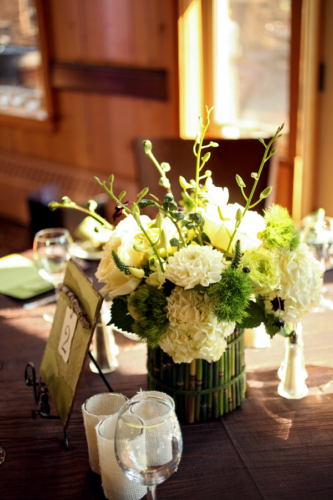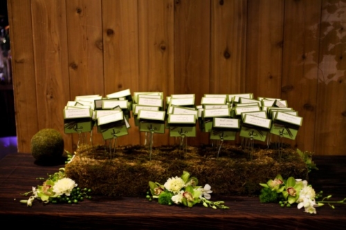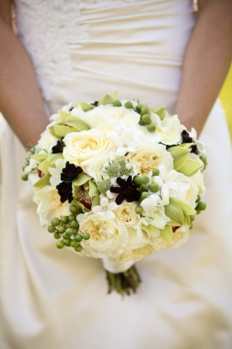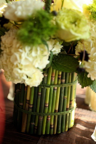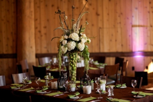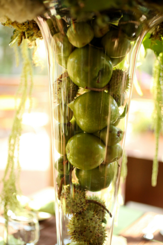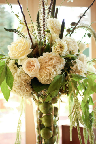 “We used green cymbidium orchids, hydrangea, graden roses, rununculus, aspen branches, moss balls, chocolate cosmos, china berry, artichokes, hanging amaranthus, hosta leaves, stephanotis, green apples, kale and succulents. Â The colors we had in mind were apple green, browns, shades of white and ivory.”