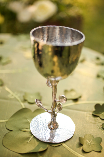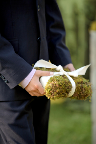 “The ceremony was non religious, but we incorporated elements from Judaism: the chuppah, the bride circling seven times around the groom, the tallis, the Kiddush cup, and breaking the glass. Â My husband is Jewish and in the Jewish tradition both parents escort the bride and the groom to the Chuppah.”