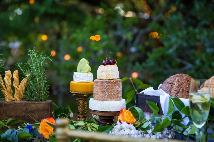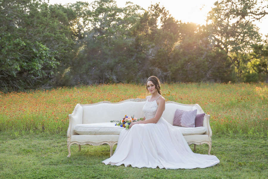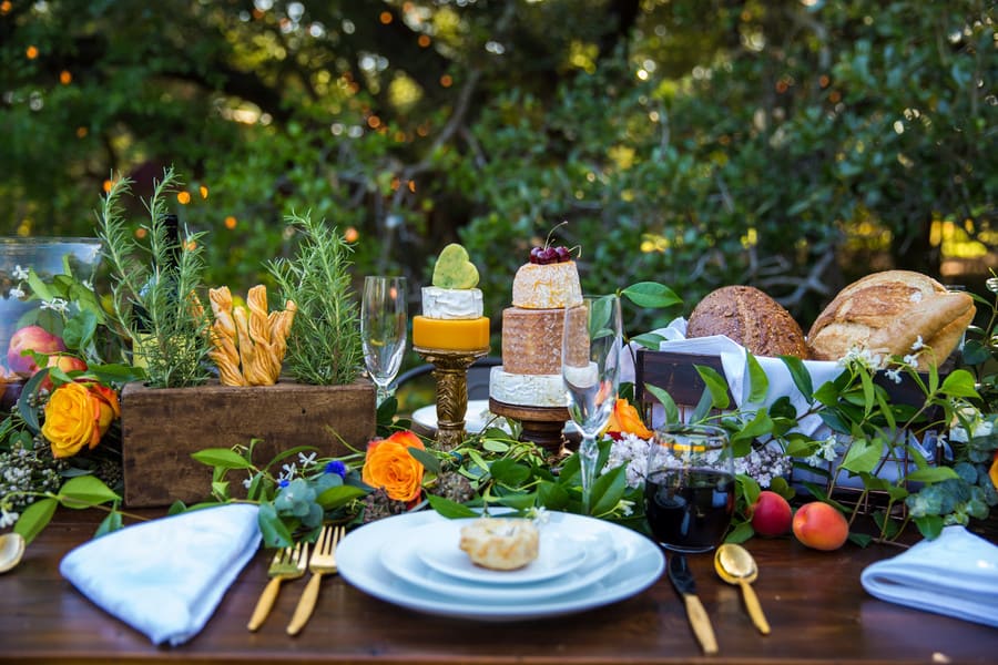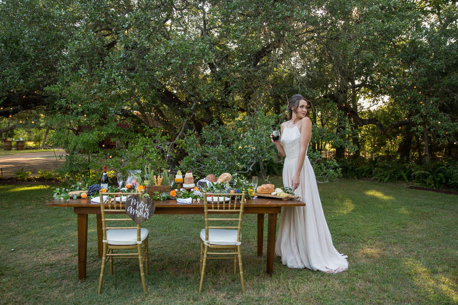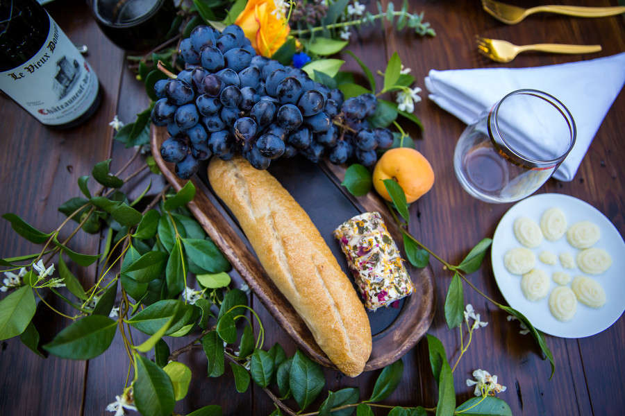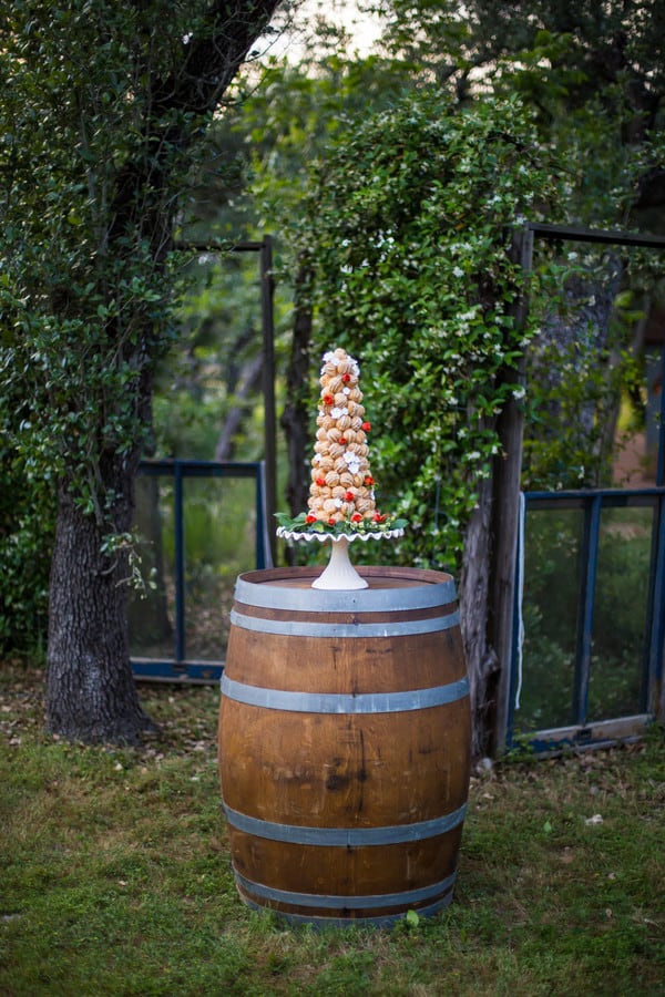Vendor Remarks: “We wanted to bring a little bit of France to Central Texas! Our inspiration was Monet- In the Garden- 1895 – Giverny. This Painting had all of the colors we love. “The venue’s wildflower fields were fully bloomed with Indian Blankets, bringing in the red and yellow. There were several open green grassy fields. The blue, lavender and wood/gold tones were brought in through accents in design elements. “We wanted all of the great comfort of bread, wine and cheeses. The fruit spread brought in touches of color and freshness. In lieu of a traditional wedding cake we opted for a french delicacy croquembouche.”Gallery