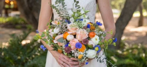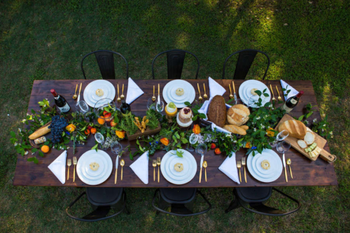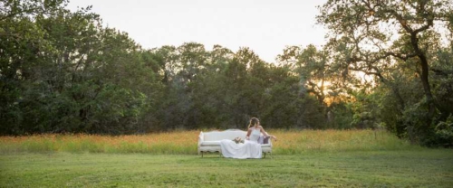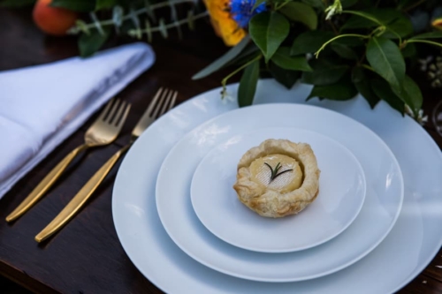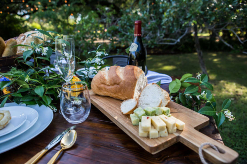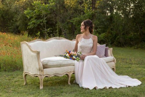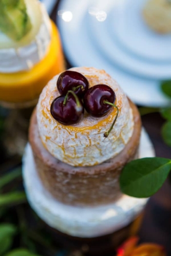 Vendor Remarks: “We wanted to bring a little bit of France to Central Texas! Our inspiration was Monet- In the Garden- 1895 – Giverny. This Painting had all of the colors we love. “The venue’s wildflower fields were fully bloomed with Indian Blankets, bringing in the red and yellow. There were several open green grassy fields. The blue, lavender and wood/gold tones were brought in through accents in design elements. “We wanted all of the great comfort of bread, wine and cheeses. The fruit spread brought in touches of color and freshness. In lieu of a traditional wedding cake we opted for a french delicacy croquembouche.”Gallery