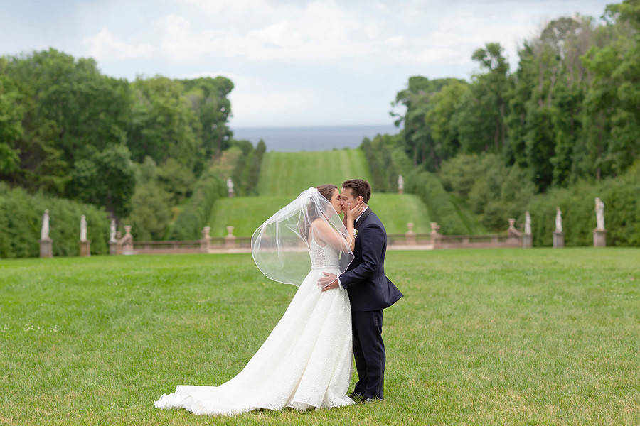 Photographers’ Comments: “With rolling green hills that lead to the ocean and gardens that feel like you are stepping back in time, the Crane Estate is an epic venue on Boston’s North Shore. It’s also one of the main filming locations for the recent Little Women movie! “Iris and Chris had their ceremony at the St. Mary-Annunciation Church in Danvers. One of my favorite photos from the entire day was the look on Chris’ face as he watched Iris walk down the aisle. After the ceremony, Chris’ brother opened a bottle of champagne for the newlyweds. Which brings me to my second favorite photo of the day. The champagne cork went flying, and champagne sprayed everyone! The looks on people’s faces as bubbly droplets of champagne went in every direction was priceless. “After their church ceremony in Danvers, guests were invited back to the Crane Estate for cocktails, dinner and dancing. Guests were blown away (almost literally, as a shortly-lived wild storm came over the shore!) by the stunning mansion and ocean views. When the storm passed, everyone ventured out to the great lawn. A giant “Connect Four” game kept kids entertained while guests enjoyed custom cocktails and one of the best sunsets we’ve ever seen at this venue. We were so happy that Iris and Chris were up for doing a few more portraits under such a magnificent sky! “To kick off the dancing, Chris stood up and sang Kenny Rogers’ song, “The Gambler”. To say he was a complete natural up on stage would be an understatement. He was incredible. Everyone sang the chorus along with him and it was such an incredible way to bring everyone in the room together in song.”Gallery