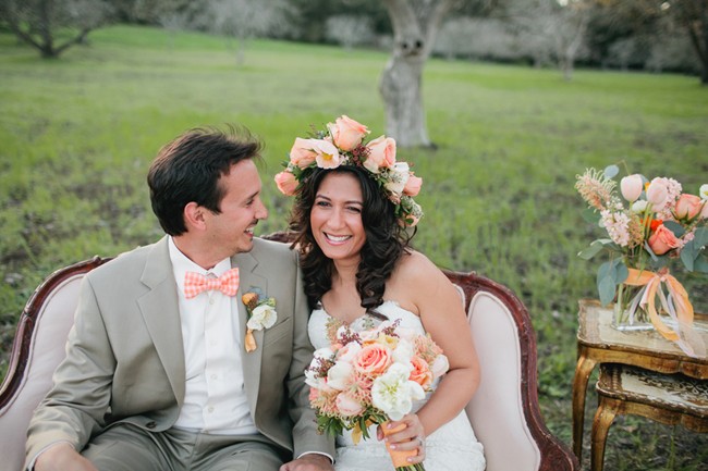 Photographer’s Remarks: “James + the Giant Peach was my favorite children’s book growing up and was the inspiration for this beautifully styled wedding shoot. The amazing group of talented vendors that I worked with made this shoot absolutely stunning. Since spring is upon us, we selected shades of peach, cream and gold. The shoot took place in a private walnut orchard just south of San Francisco.”