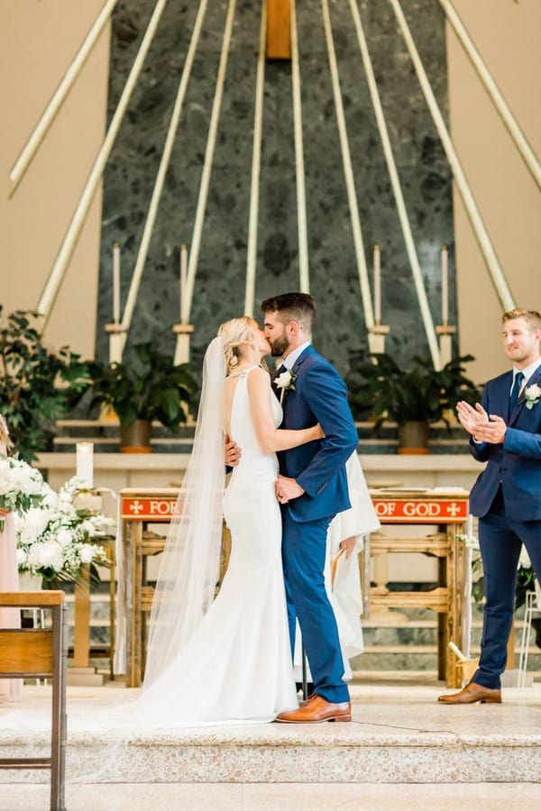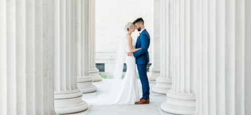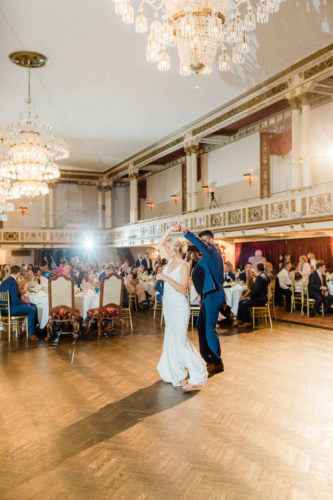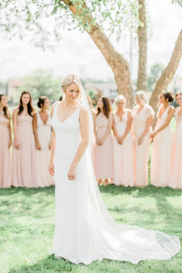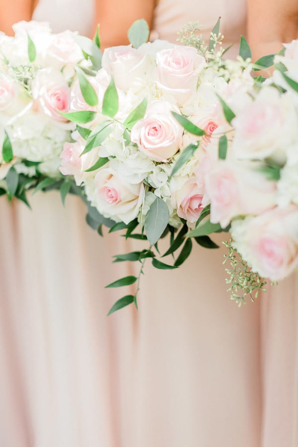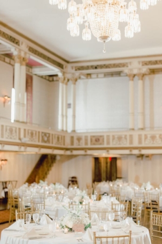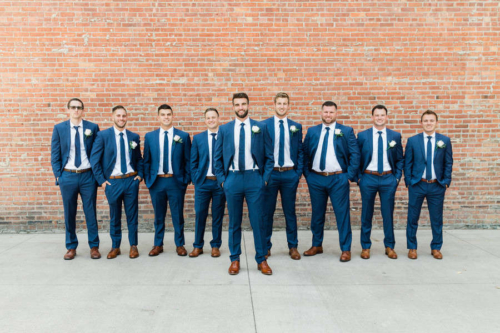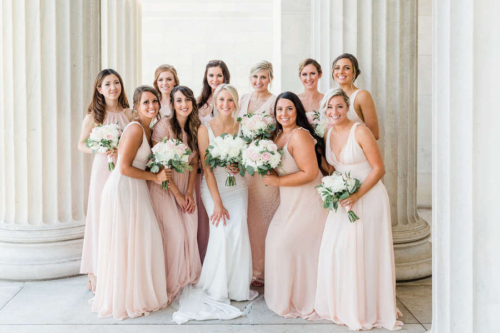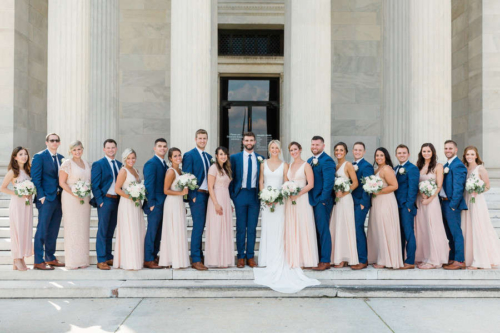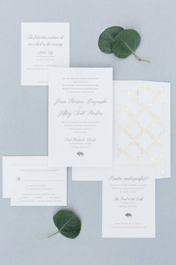 Jenna + Jeff know how to party, and what a party it was! Every measure was taken to ensure their day was fun and that those closest to them had a great time while they experienced , Jenna’s home town! The day started off with Hair and Makeup for 10 girls! Hair Reformation by Natalie and her team had everyone looking gorgeous in record time. We were seriously impressed by their beautiful work and efficiency! Jenna wore a gorgeous fitted white gown from M.A. Carr Bridal that featured a low cut back adorned with beaded straps for a touch of sparkle. She paired her dress with a chic updo and cathedral length veil. Jenna completed her look with shimmery Jimmy Choo heels. She was beyond stunning! We witnessed a sentimental moment when Jenna’s dad saw his little girl in her wedding dress, eyes welled up with tears. It was so sweet!! Jenna’s bridesmaids were beautiful in a their many variations of flowing blush gowns from Lulu’s and Adrianna Papell. The guys sported Men’s Wearhouse Calvin Klein Extreme Slim Fit suits in blue with tan shoes. All of the bouquets, bouts and table arrangements by Woyshner’s Flower Shop looked lovely with white roses and hydrangeas, lush greenery and blush accents. Jenna + Jeff were married with a traditional Catholic ceremony held at Saint Michael Church in downtown Buffalo, where Jenna’s family has long attended mass. After the ceremony, we took some wedding portraits at the ever popular Albright-Knox Art Gallery, the same location where Jenna’s parents had their wedding photos taken over 30 years ago! As Jenna + Jeff walked down the gallery stairs, back to their Status Limousine party bus, they were greeted with cheers and dancing that literally shook the bus. It was quite the welcome and a sure sign that it was time to par-tay! They took a few laps in the bus before cocktail hour at the renowned Statler City. The golden ballroom looked amazing with the sheer essence of it’s historic nostalgia and all of Jenna and Jeff’s personal touches. White florals and greens, combined with the vast crystal chandeliers and candlelight provided a grand and romantic feel. The party got started when the bride and groom walked in to Def Leppard’s “Pour Some Sugar on Me.” Their energy was infectious! Thoughtful and emotional toasts to the couple were exchanged, followed by first dances full of crowd pleasing spins and dips. Everyone then congregated to the dance floor as Shine played so many great songs. They were unbelievable, even coming down on to the dance floor allowing the crowd sing along on the mike. Blackhorse Videography was there to document it all and we cannot wait to see that video! Everyone, young and old, was singing and dancing all night long. Perhaps the highlight of the night was when the bride got on stage and sang to Shania Twain’s “Man! I Feel Like a Woman!” The crowd went wild! It was such a good time! The whole day was just perfect, and fun. So much fun!!! Congratulations Jenna + Jeff! We wish you a lifetime of love, laughter and good times together!!Gallery