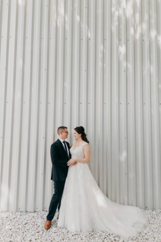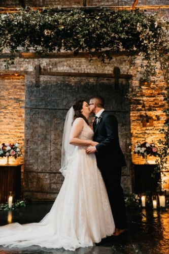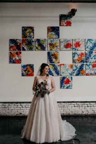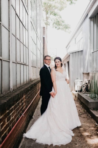 Q: Tell us about your wedding! “Oh wow! We got engaged in late December and my mother and I looked at venues in mid-January, when we went to King Plow I knew this would be a great venue to have the wedding and reception. “It was a lot to do in a short amount of time as we picked the end of May to have the event! My mother contacted Leslie West ASAP to see if she would be available for my wedding, and fortunately she was able to be there. “Leslie has been the photographer at two of my sisters’ weddings and we knew we would not have to worry about the pictures. My biggest goal for the wedding was that everyone had a memorable, and incredible time!” Q: Let’s talk wedding decor “Bold Events was wonderful to work with, Jess reviewed my pinterest board and brought it to life. I knew I wanted some softness to even out the beauty of the brick walls and the industrial feel of the space. “I loved the candles and flower arrangements, as well as the inclusion of succulents, one of my favorite plants. There was a beautiful hanging arrangement at the alter that was also used to hang above the cake. The space felt inviting to everyone!” Q: What were the florals like in your wedding “Yes! I loved my flowers with colors of burgundy, rose pink, and lots of greenery. Each of the bridesmaids had a beautiful bouquet, and the mothers of the bride and groom had a gorgeous corsage. The men in the bridal party had boutineers that matched the bridal party flowers. The head table had flowers and greenery down the middle, and each banquet table had an arrangement of flowers.” Q: Did you personalize the day in any way? “We had mini crabcakes as an appetizer during cocktail hour in honor of my father’s Maryland heritage (they were so great!). At the end of the evening we had a station called the donut went down to Georgia — it was definitively a crowd pleaser and quite the show! “Krispy Kreme doughnuts were flambeed with Makers Mark and topped with a house-made Coca-Cola syrup and a scoop of vanilla ice cream. They were fun to watch being made and delicious to eat. Our band was so wonderful, at one point all the bridesmaids and I were dancing on the stage to the song rolling on the real road.” Q: Let’s talk fashion “As soon as the venue was chosen, my mother, Janet called Formally Yours of Lilburn for an appointment. I had decided on a soft romantic dress, A-line. At Formally Yours they pulled many choices but the dress I tried on first was my favorite and was the one chosen. It was so romantic and a perfect fit. “Andrew was excited to go to Sid Mashburn for a handsome suit, the tie and shirt. His shoes were purchased from Cobbler Union at Ponce City Market.” Q: How did you meet? “I met Andrew in 2005 through a friend from college that was good friends with Andrew’s best friend. Andrew and I met at a party and hit it off. We went on a few dates and have been together since. Andrew proposed just before Christmas, 2017. He was very romantic with his proposal. He also included me in designing my engagement ring which included heirloom diamonds from his great grandmother, and his mother.” Q: What was the most anticipated or special moment of your wedding day? “The first look, Leslie, our photographer found some great spots in the shade that I had not seen in other people’s wedding photos from that venue. It was nice to see Andrew all dressed up and he loved my dress! It was also nice that our officiant included our nine month old son, James in the ceremony by blessing him.” Q: Do you have any wedding planning or marriage advice that you’d like to share with other couples planning their day? “Enjoy every minute! Do not stress out over every detail, not everything is going to be perfect. I definitely did not worry about things the day of and I think people were impressed about how calm I was that day.”Gallery