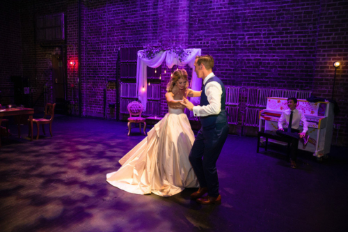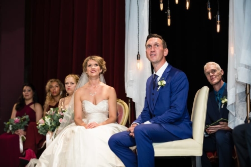 “John and Jenny’s wedding was full of their own spirit and joy that they brought in each element of the day. Their ceremony was held on the stage, with musician friends serenading them from the balcony at moments during. And they even participated in the singing during a couple songs during their reception.