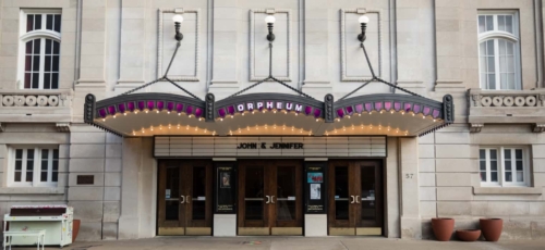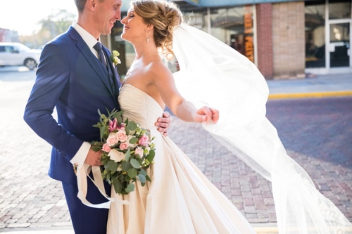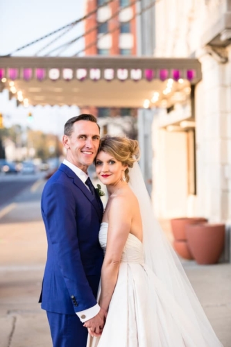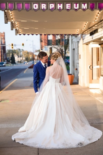 “The couple wanted a classic and elegant wedding day. Jenny’s stunning and timeless, Paloma Blanca, wedding dress set the perfect tone for the event . They really wanted the colors of the historic Orpheum Theatre, in Jenny’s home town, to be showcased, which is primarily gold and deep red.