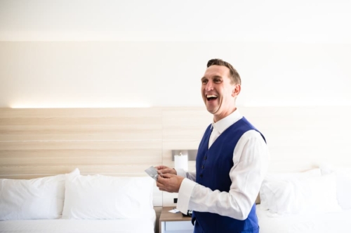 “John wanted a bright blue three-piece suit. He also wanted the suit custom made for him from a Canadian designer. Eph Apparel was a perfect choice for us. He also knew he wanted french cuffs, with fantastic cuff links. He left the cuff links up to me, and I found a designer that made cuff links from British six pence coins. I had his links made from the year he was born, surrounded in rose gold to match his wedding band. I gave them to him as a gift on the morning of the wedding. I also would be wearing a six pence coin tied to my she that he gave me years ago, to complete my something old, new, borrowed, blue (and a sixpence in her shoe).