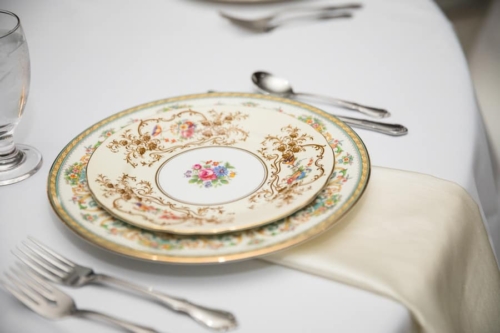 “All of the decor was done by myself or my talented friends! I love vintage china, and because our space for dinner would be sparingly decorated, it was a perfect way to dress up the tables. For our reception, lighting played a huge role in transforming the look of the theatre. I left it all up to the amazing technical team at the Orpheum. We knew we wanted lights strung through the audience, and the rest, we left up to them!”