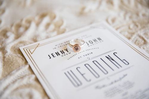 “We kept decor simple, with burgundy and blues for pops of color supported by neutrals. John wanted a blue suit, so his groomsmen complemented him in darker blues. I let my bridesmaids choose their dress and color, which turned out brilliantly with my Maid of Honor fully expressing her big personality in rose gold sequins. I loved her choice! We wanted the day to feel classic and timeless, formal and sophisticated without being too stuffy.”