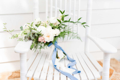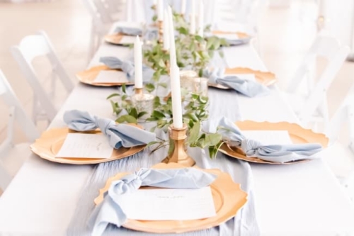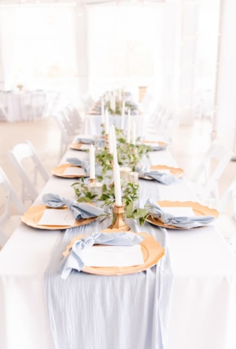 A2: I knew I wanted to incorporate a lot of greenery and magnolia leaves into the reception space to incorporate the naturally occurring vibe of the venue. For our color palette, I love very neutral colors so we wanted to stick to that. Our only “color” was a soft dusty blue.