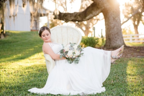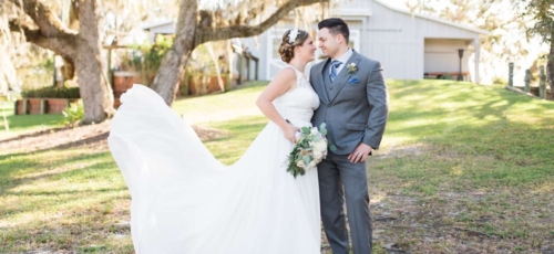 Jessica & Jason were married at a wonderful venue called Up the Creek Farms on the west coast of Florida. Rustic details come together to create a day that looks both elegant and unique. A darker blue thistle color for the bridesmaid dresses extend to the reception centerpiece florals and match the gold accents quite well.