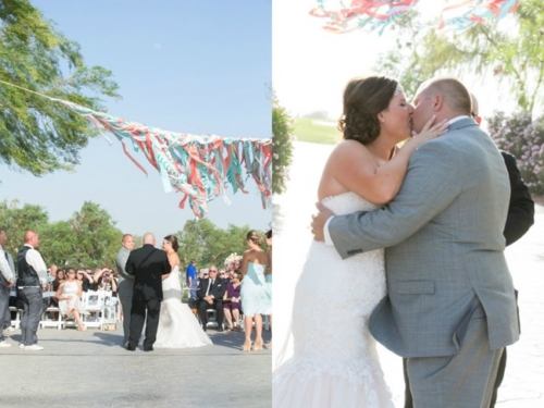 Today’s mint and coral shabby chic wedding was captured by Erica Mendenhall Photography, and I love that the ceremony location was on a bridge.  Plus, the bride is wearing a Maggie Soterro gown, so it is truly a win-win all around.