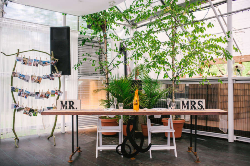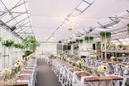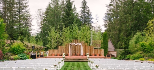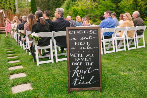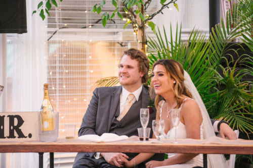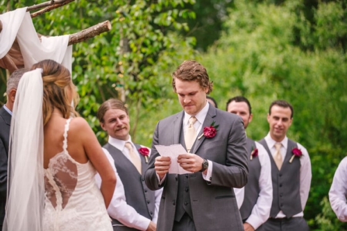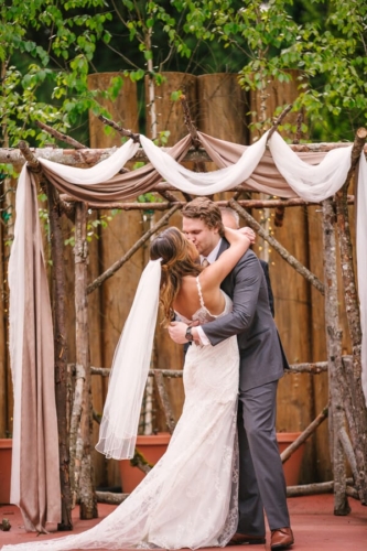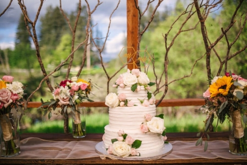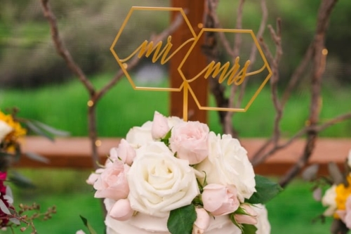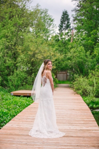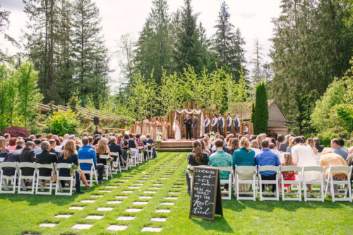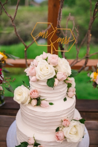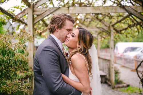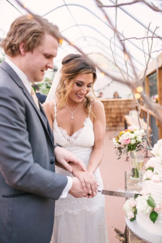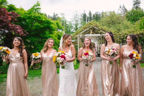 Photographer’s Comments: “Jess and Marty met on a dating app. Marty was the first and only guy Jess agreed to meet up with. After a first date of shopping at Target and a second date including dinner and a movie, the rest is history. On New Year’s Day, high in the mountains of the Pacific Northwest, Marty proposed to Jess in the snow. “For the wedding they went for a theme of simple, rustic elegance. The ceremony took place outside on the grass, at a wooden altar, while the reception was set inside the greenhouse. “Tables were lined with greenery and tan and white linens. Simple but lovely pops of white and pink flowers and gold lanterns and votive candle holders decorated both spaces. “Guests were welcome to wander about the gardens, and it truly felt like the most perfect, beautiful, intimate affair where family could reconnect and celebrate in their love for the bride and groom. “Their wedding day was everything they dreamed. Jess looked positively STUNNING in her silk and lace Claire Pettibone gown, fitted perfectly to her. The back of that dress made everyone’s jaws drop. “Her bridesmaids wore sparkling gold dresses and carried colorful bouquets with pops of pink and sunflowers. “The groomsmen kept it classy with gray suits and matching gold ties, with their own pops of fuschia boutonnieres. But most importantly, they laughed and cried and thoroughly enjoyed their day with all their loved ones.”Gallery