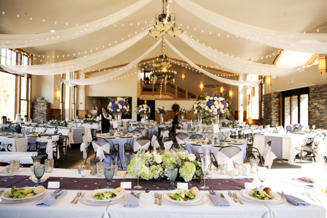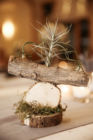 “We had Moonlight Lighting add little twinkle lights, white sashes, and one large chandelier to the ceiling of the Moonbeam Lodge, where we had our reception. My mother and I went and bought large, drooping flowers from Modern Display and tied them into a circle so they could hang from the chandelier. Moonlight Lighting also brought in some birch trees with twinkle lights on them to place around the head table.”