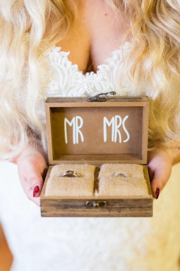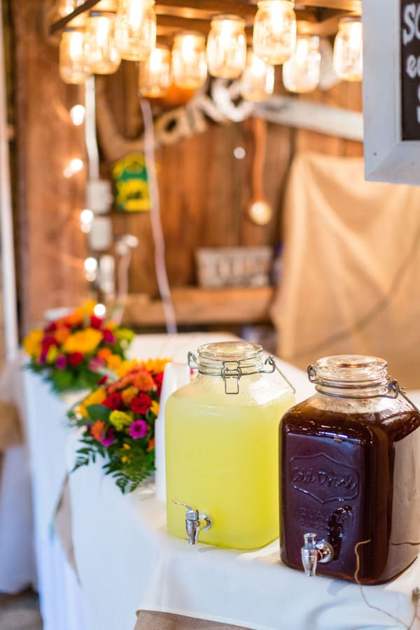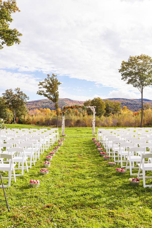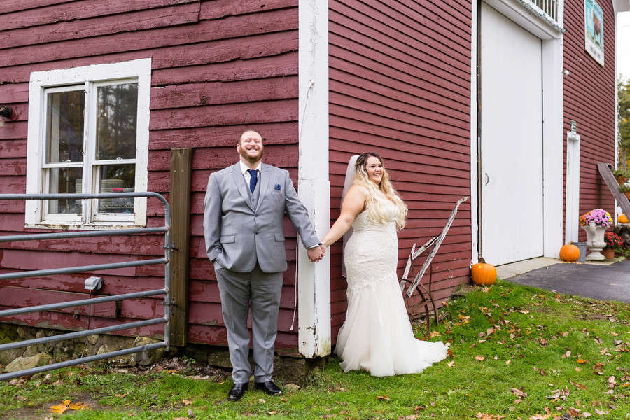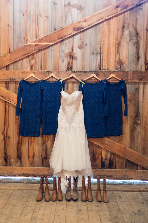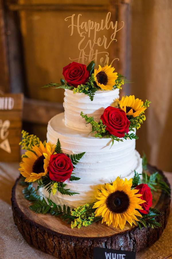 Photographer’s Comments: “Jordan and Thomas envisioned their wedding as a rustic fairy tale. They both have favorite Disney movies: hers is Snow White, and his is Beauty and the Beast. Symbolism from both of these movies made their way into their wedding in the most beautiful ways. “Jordan chose apples for her symbol, and she placed buckets full of apples along the ceremony aisle (which were hand picked from a local orchard with help from her bridesmaids). I loved how her nails were also painted dark red and looked so elegant with her long princess hair that tumbled down over her shoulders. “Thomas, with his huge Beauty and the Beast red rose tattoo on his forearm, requested that the florist choose the biggest, most perfect single red rose for his boutonniere. They also chose a single red rose for the centerpiece for their head table. The rest of the bouquets were bright cheerful sunflowers mingled with red roses, a perfect nod to the October season. “There were so many DIY aspects to their wedding. Not content with one guest favor, Jordan made several homemade favors for guests to enjoy: s’mores kits, caramel apples, caramel popcorn, and handmade dog treats. “This rural, rustic location was important to them, and they maximized it with cowboy boots for the bridal party, a hayride for guests out to the ceremony site, and an actual antique barn for the reception. “The day started out with very gloomy weather, and arriving at the ceremony site was a bit of a bummer as a cold rain started falling with no shelter in sight. The drizzle eventually tapered off, but it remained dark and cloudy until Jordan and Thomas began their ring exchange. “At that exact moment, the sun emerged, and by the time they made their processional down the aisle, they were walking away into full sunshine. It really was a fairy tale.”Gallery