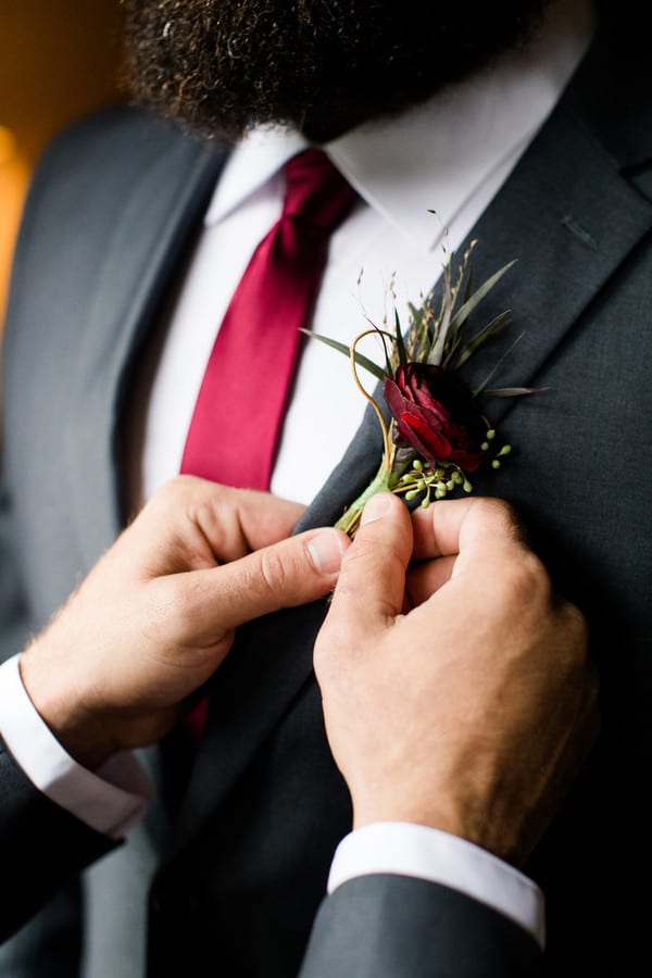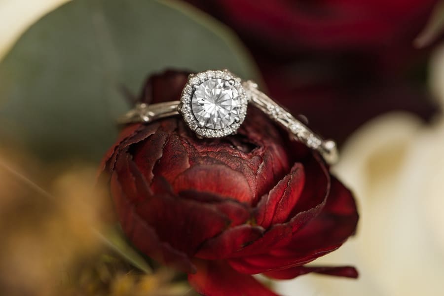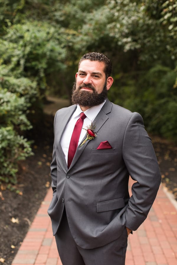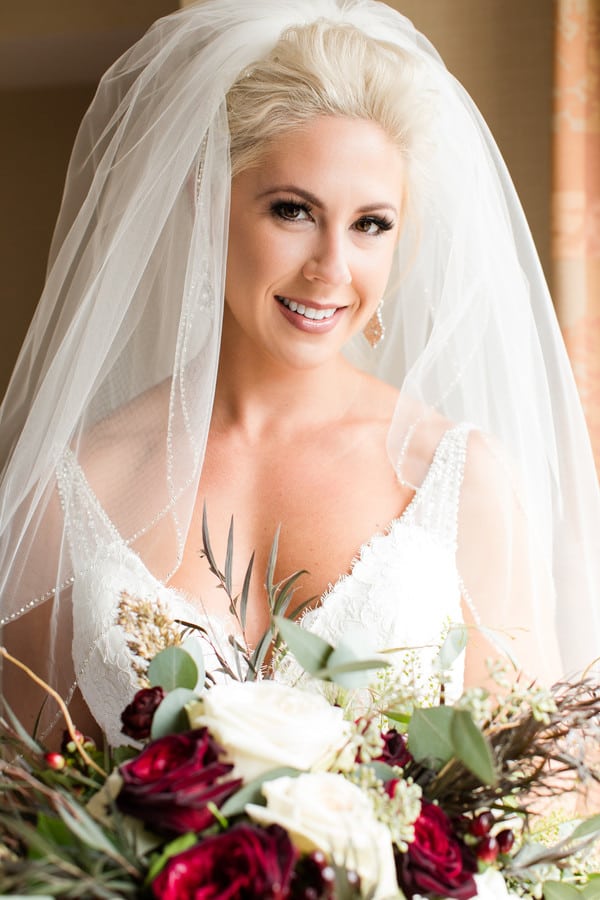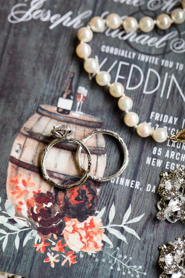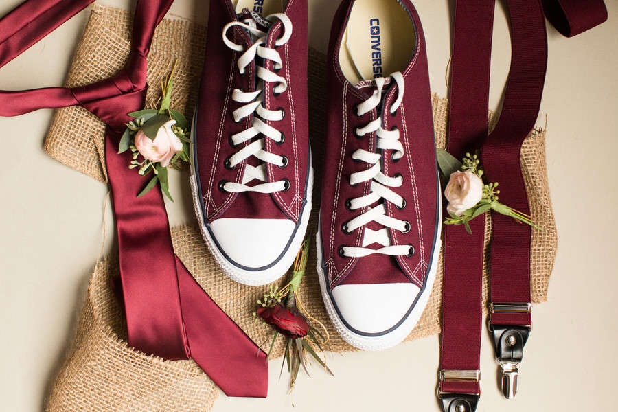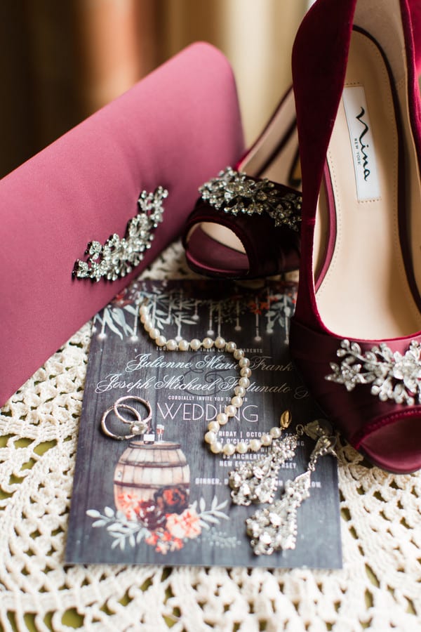 Q1: Tell us about your wedding! “Laurita Winery was truly the only venue we considered having our wedding at.  The building and the grounds blend just the right amount of rustic and refined elements.  The color palette was a nod to our two favorite wines, Cabernet Sauvignon for her and Riesling for him.  We also used many accents of gold throughout our details for a classic look that would resound for many years to come.” Q2: Let’s talk wedding decor “We were huge into DIY for this wedding decor.  The outdoor space already had great structure, thanks to Laurita Winery, so I only had to have the florist add two floral altar pieces, and I added floating candles in glass tubes down the aisle for that glowy look. “For the reception,  we created a bar sign out of wine corks that said CHEERS, displayed several photos from both sides of the family, and spent countless hours creating the perfect centerpieces from donated wine bottles, planks of cedar, fairy lights, and grapevines.  It was a labor of love (thanks mom and dad!) but it was magical when it all came together.” Q3: What were the florals like in your wedding? “I trusted the designers at Narcissus Florals to create the look for the day.  I admitted to them right away that I had a color scheme in mind, but knew nothing about flowers. “They made me feel understood and I trusted their expertise to make it come to life with the perfect blooms.  They have also dressed the space at Laurita countless times before my wedding so their familiarity with the venue ensured they’d created the perfect vision.” Q4: Did you personalize the day in any way? “The groom and his men wore custom Chuck Taylors in their suits! Joe is such a laid back guy that it totally made sense. “We also used Limelight Entertainment as our DJ and without him, the playlist and vibe would have been lacking-Chris nailed the energy and the flow and played to all the ages we had as guests. “We also had a groom’s cake in the shape of an open humidor that was not only eye-catching but absolutely delicious from Chocolate Carrousel. “Lastly, Joe really wanted a cigar bar out on the terrace after the ceremony-it was super cool among the fire pits for the men to step outside and celebrate in that age-old tradition.” Q5: Let’s talk fashion “The vision stemmed from my engagement ring-large haloed moissanite stone on a band fashioned to look like a birch branch of white gold.  Much like the venue, I wanted the right balance of rustic and refined. “I opted for a lace sheath with art deco blinged out straps and low back with buttons down the train. “Joe’s grandma picked out my perfect earrings to match my straps, and our dear friend lent me her pearl bracelet for just a touch of class and tradition.  I also wanted fun footwear and wore wine-colored velvet pumps with a matching clutch by Nina. “My hair and makeup artist, Lisamarie Charles, gave me a glamorous but whimsical updo and the perfect bridal glow.  I’ve never felt so beautiful in my life. Q6: How did you meet? “Tinder. I know it’s not the most romantic answer but it’s true.  In this modern world it becomes very difficult to meet people organically.  Joe and I clicked from the first date and I knew we’d be a long term thing within the first week, I just didn’t realize we signed up for forever when I swiped right! Q7: What was the most anticipated or special moment of your wedding day? ” I truly couldn’t wait to share my vows with Joe.  I worried about saying the right thing for months for that monumental moment but in truth I just spoke from the heart.  I also was excited for my first look with my dad!  He handled it well though, only a few quick tears, but I will never forget it.  The whole day is special, and every bride needs to just soak it in and appreciate the love and effort that goes into this day.” Q8: Do you have any wedding planning or marriage advice that you’d like to share with other couples planning their day?Wedding planning: Don’t micromanage every detail! The people you hire are professionals and they know this is the biggest day of your life-they will do everything in their power to make it all wonderful.  And if someone offers to help you, take them up on it. “After your ceremony, take a few minutes of just you two to catch your breath and enjoy what you just committed to one another-the reception is going to fly by and you might not get to have that chance again until the next day. “Marriage advice: make sure you married your best friend, the laughs are worth it when life gets silly.”