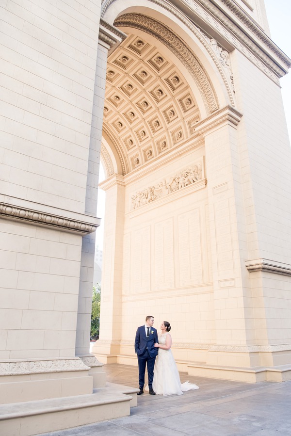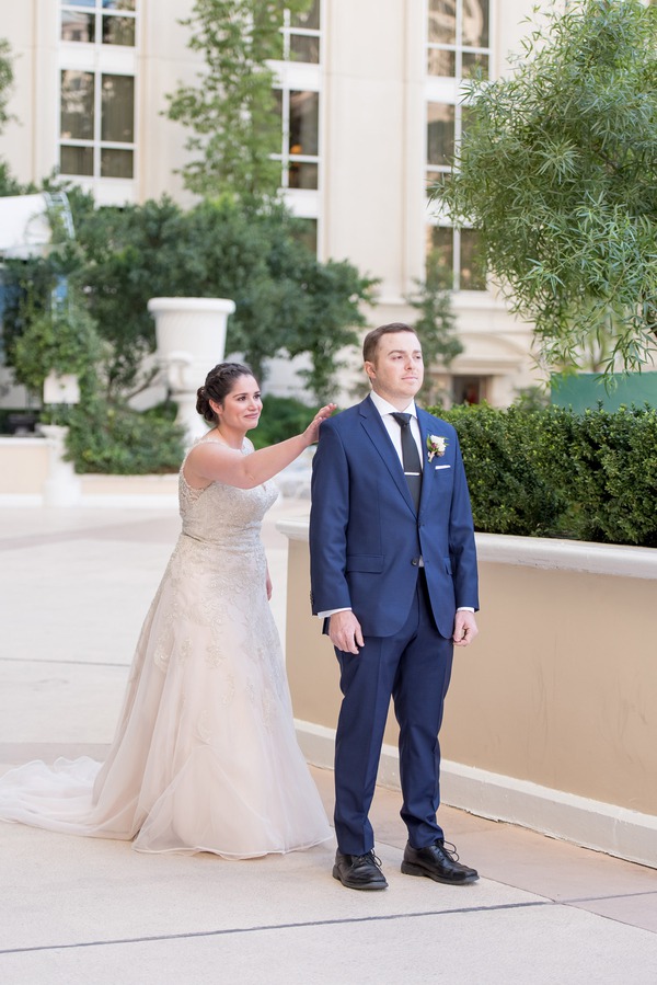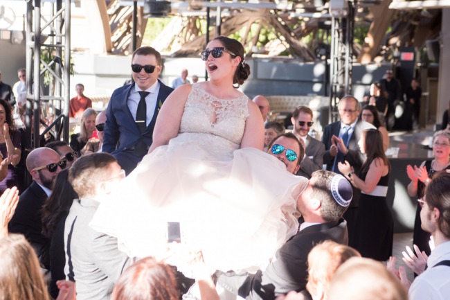 Photographer’s Remarks: “Julia & Josh had been together for 10 years before their wedding day, and actually met and lived in Israel before returning home to the US. They chose their hometown of Las Vegas for their wedding, and knew they wanted an ultra-fun, yet glamorous vibe. “Chateau Nightclub at Paris Las Vegas Hotel & Casino was the perfect mix to give their guests an amazing experience. After getting ready in separate rooms on the property, we did a beautiful, sentimental first look out by the luxurious pool deck. The area has ivy growing up the walls – the perfect backdrop for elegant bridal party and family portraits.” “Julia had an absolutely gorgeous purple and cream bouquet with lilac silk ribbon to complete her look. The ketubah signing and ceremony took place on the nightclub floor with a romantic chuppah adorned with roses and pomegranates. “After the ceremony, I took the couple to the front of Paris Hotel to get some portraits with the property’s beautiful French inspired architecture. Guests headed upstairs to join the cocktail hour and were surprised with showgirls to greet them! The rooftop is right beneath the iconic Eiffel Tower and was decorated in shades of lilac, plum, cream, and blush. There’s a view of Las Vegas Boulevard and the Bellagio fountains are directly across the street — you simply can’t get a more Vegas experience from any other rooftop on the Strip.” “Guests were seated at a mix of tables and booths as Julia and Josh arrived and were led into the reception by the showgirls. The started off the party with an intimate first dance (wearing their matching, engraved wayfarer shades), followed by a crazy energetic hora. The rest of the night was a mix of joy, a few happy tears, high energy dancing and laughter.” “Julia & Josh truly had the classic Vegas Strip wedding with all the glitz and glam, but none of the cheese. Their elegant, lively, romantic wedding was one for the books and I’m so happy to have been part of their big day!Gallery