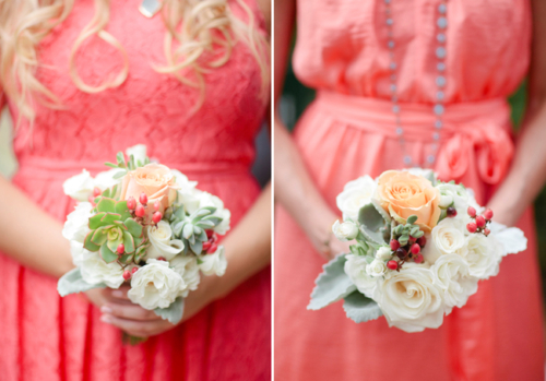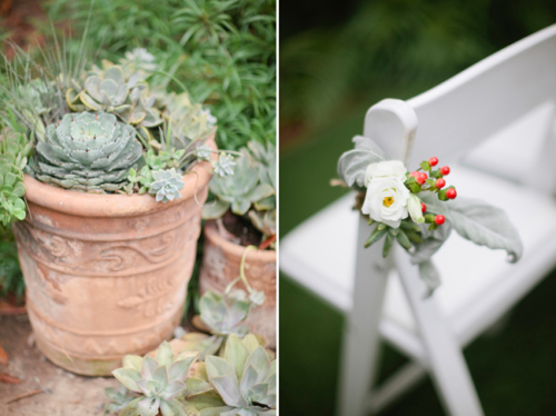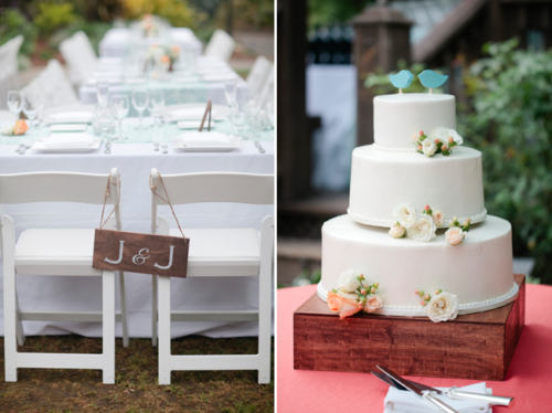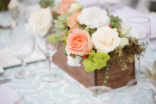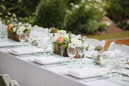 “Our centerpieces were a collection of succulents and fresh flowers, arranged in my dad’s wooden boxes and in various silver vessels that have been in my family for years. We had gorgeous succulents, café au lait dahlias, and coral roses in everything from silver pitchers to silver ladles to sliver sugar bowl lids. My mom grew all of the succulents in our garden and, with fresh flowers added by Teri at Twiggs, put together all of the centerpiece arrangements. We served a delicious and unique family style dinner at long kings tables, layered with beautiful linens from La Tavola Linens, and stacked with rustic wooden boxes and silver vessels overflowing with succulents and fresh blooms. Dinner and dancing in the garden on a warm summer night with café lights stung overhead was truly magical.”
