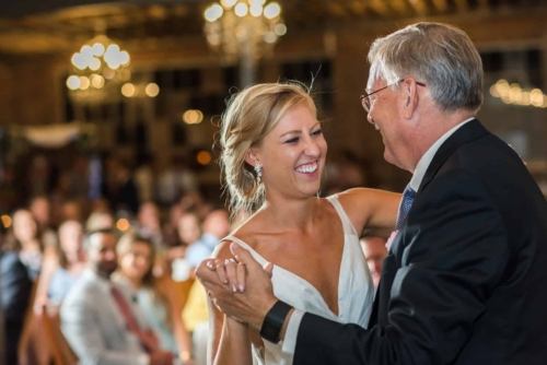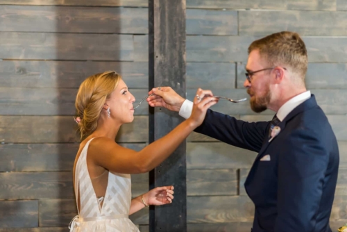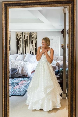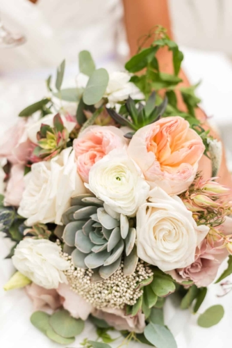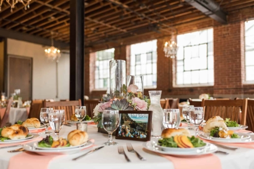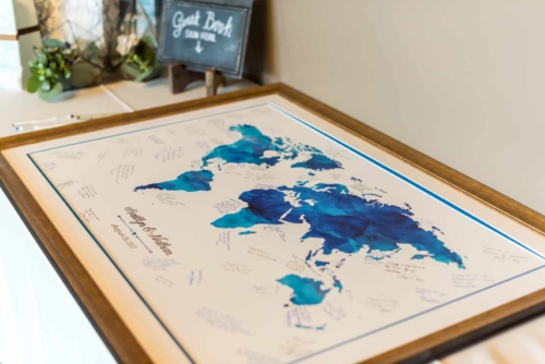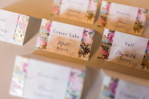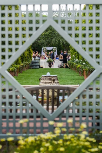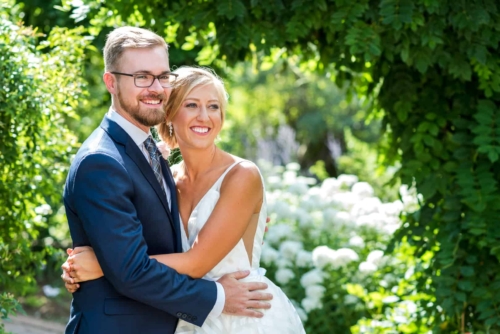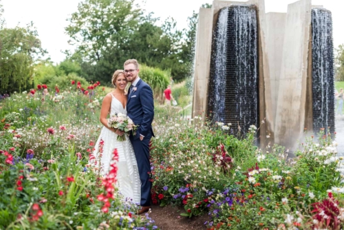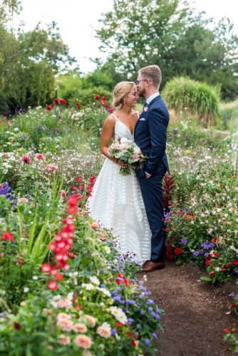 Photographer’s Comments: “With a mutual love of travel, outdoors and nature, Denver couple Kaitlyn and Nate decided to have their wedding at the centrally located Denver Botanic Gardens on a splendid August day. “They wanted the make sure that the venue reflected their values and personalities while allowing them to enjoy the day with their loved ones, and the gardens fit the bill. “The two met at a party thrown by a mutual friend and have been inseparable ever since. After a few years of dating, Nate proposed at Cheeseman Park during a picnic date night complete with wine they had purchased on a recent trip to Napa, California and the ring hidden inside of a book that he had concocted himself. “The wonderful thing about the botanic gardens is that it provides such a beautiful backdrop, making decorations minimal and allowing for the beauty of nature to shine through, but flowers of course are a staple for any wedding. “Kaitlyn notes, ‘The florals in our wedding were quintessential Colorado summer, with a more neutral palate with accents of peach and light green. Roses, succulents, peonies, and some greenery were all featured in our bouquets. The flowers really set the mood for a romantic, yet quirky wedding.’ “Kaitlyn’s dress also screams summer with a low V-neck, exposed back, full skirt and a striped lightweight fabric paired with gold flat sandals and minimalistic jewelry, the look was complete. “The day was as unique as the couple themselves. The food consisted of a mac and cheese bar, taco stand and of course the traditional beef and roasted veggies. “The guests were provided with champagne, served in the couples personal collection of champagne glasses, to enjoy as they explored the garden’s grounds. “As if the couple couldn’t have had a more unique twist to their special day, they had their guests sign a framed ‘guest map’ instead of the traditional guest book (more alternative guest book ideas here), once again expressing their love of travel. Kaitlyn’s favorite moment of the day was reading their handwritten vows, reflecting on the type of marriage they wanted and making their own promises to each other as they started their married life.”About This Wedding