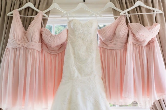 “I gave my bridesmaids matching floral robes to get ready in, pearl-like jewelry (each a different style) and a white pearl accented hanger for their dress. I wrapped their gifts in a keepsake box, tied with lace ribbon.”