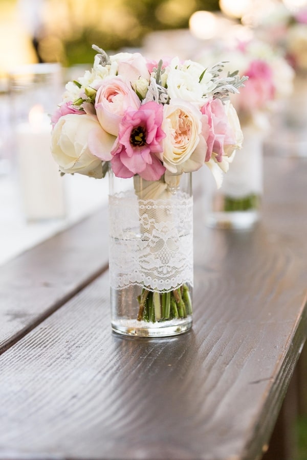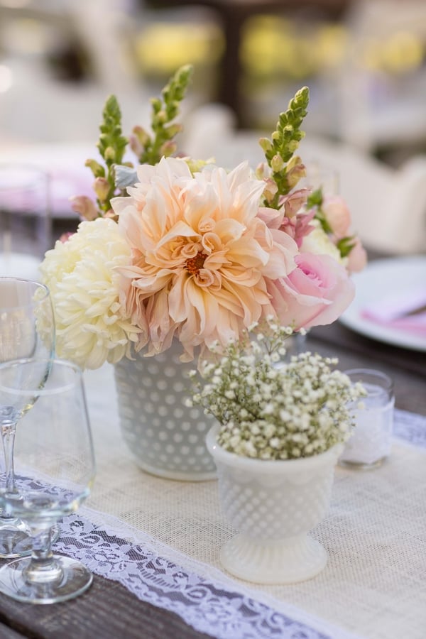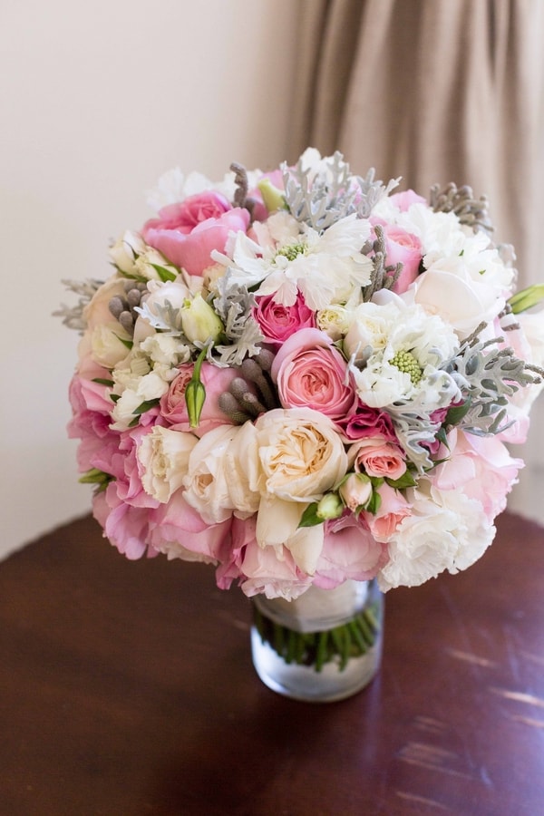 “I love flowers! All different types of them. In fact, I may have gone a touch overboard with what I wanted when it came to flowers. Thankfully, we had a great florist that worked with us for months and helped us select flowers that would hold up well for a warm summer wedding and that wouldn’t break the bank! We chose garden roses, cabbage roses, lisianthus, scabiosa, dusty miller, silver brunia and spray roses. For my centerpieces, I bravely opted to put them together myself, with the help of a few friends and family of course. They consisted of football mums, hydrangea, snapdragons and a few others listed above.”