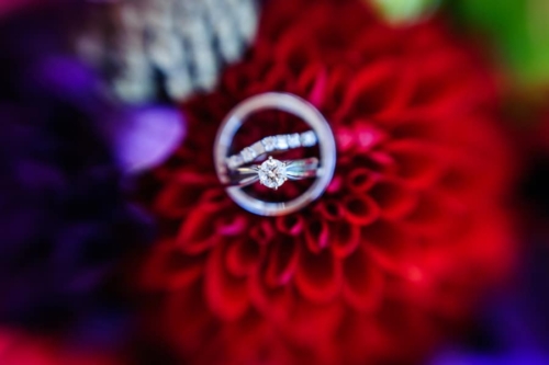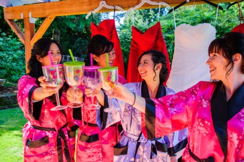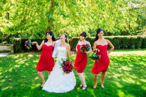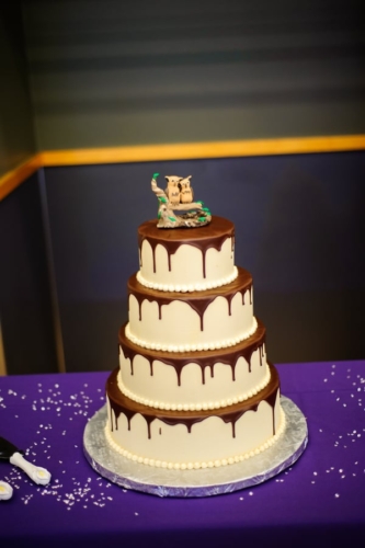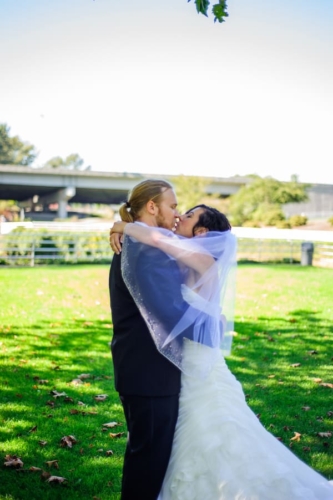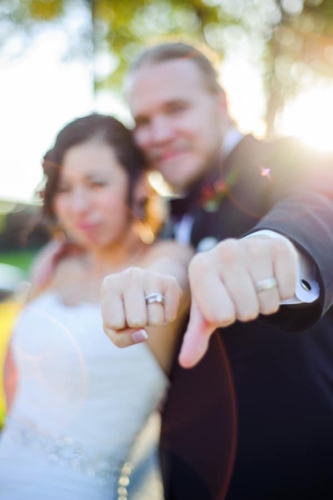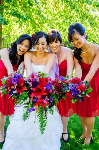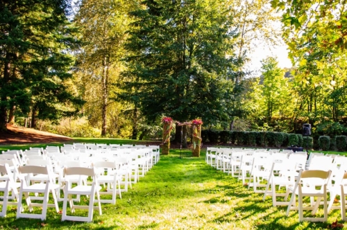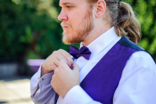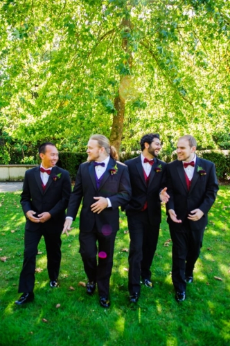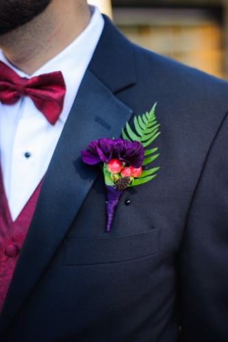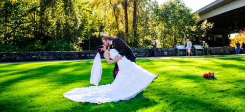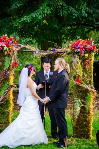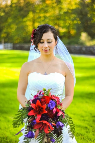 How did you two meet? “We met in Mrs. Fee’s 5th grade class. We knew each other but not well. Kami thought Sean was cute. We were then reintroduced during our high school orientation and ended up having 3 classes together. Thus began our awkward teenage relationship. Tell me about the proposal? “Sean was in town for the summer, he was attending NMSU for grad school. It was wedding cake and graduation season so Kami was super busy at work, also earlier that week Kami had been rear ended. “Sean had mentioned going on a picnic. Sean packed sandwiches, snacks, and other treats. Kami had to work overtime at work that day then they had to drop off her car at the mechanic for an estimate, thus making them very late for their picnic date. “Once everything was taken care of Sean and Kami went to Carkeek Park and Sean being a little impatient for an unknown reason spent a good 15 minutes looking for a ‘good picnic spot.’ Sean unpacked the picnic blanket and food. Before they could eat too much Sean tried to get Kami to stand up while he was on his knees (by saying ‘I’m taller then you’) causing Kami to become suspicious. He then pulled the ring out of his pocket, proposed, and revealed fancy reservations at the Melting Pot. I would love to hear about your vision, the unique details that you infused, any DIY projects that you did, etc? “For the wedding Jaimee was really able to get a feel of what I wanted. We had a romantic type feel with our deep red and dark purple colors. I wanted a nice almost classy with a little bit of bling. DIY we did mason jars with chalkboard stickers on them. I designed different animal and leaf shapes, we had I think 7 different designs. “I also designed a monogram that we stamped on each jar. These jars were for people to use throughout the night and to take home with them. I also made the cake topper with oven bake clay. What was your wedding theme? Woodsy, classy, romantic, with a little bit of bling.What colors were used? Deep red and dark purple.Please tell me what flowers were used in the centerpieces and other elements. Wide range of flowers, including lilies, hydrangeas, roses, etc.Highlights from the Ceremony and Reception