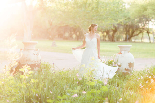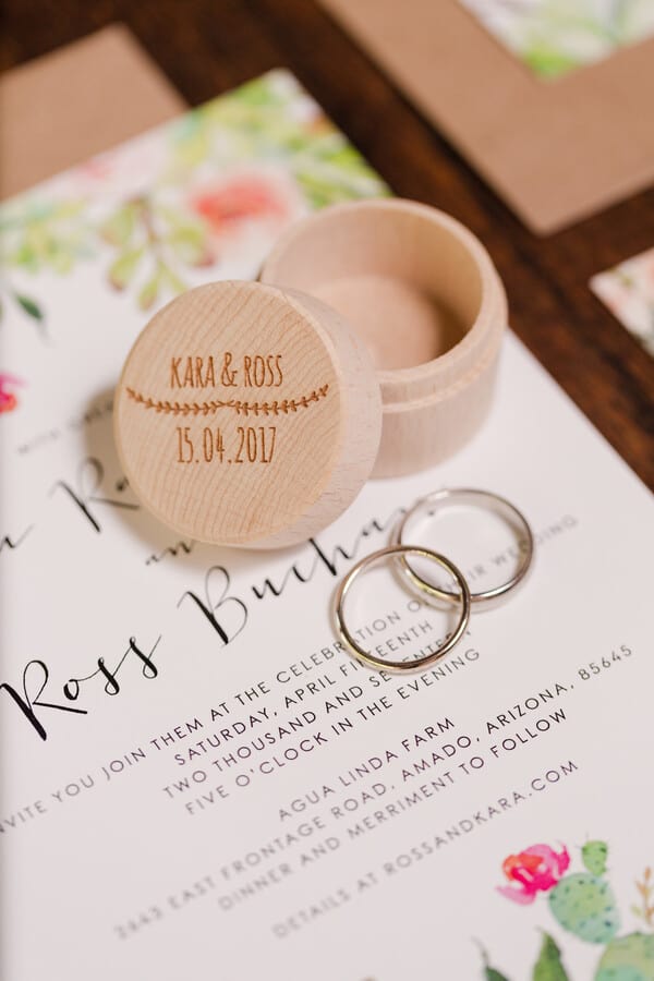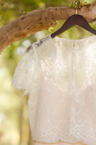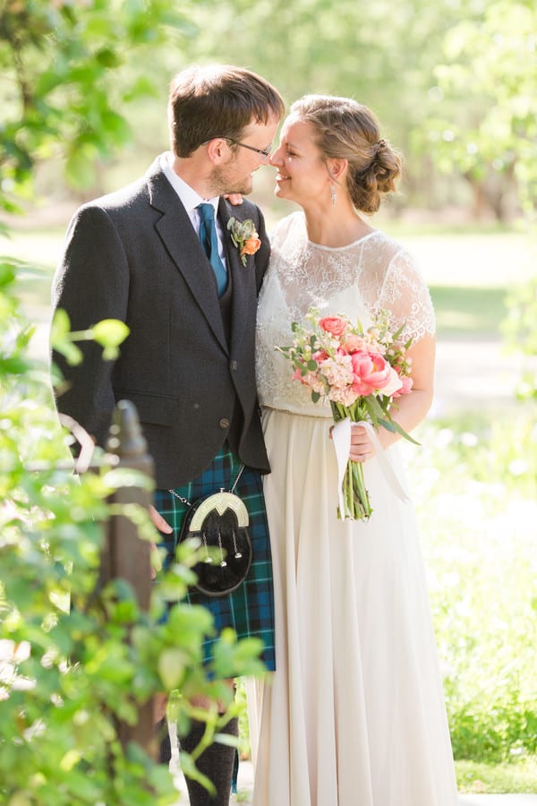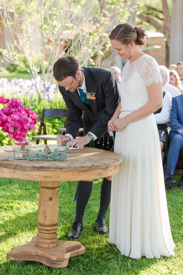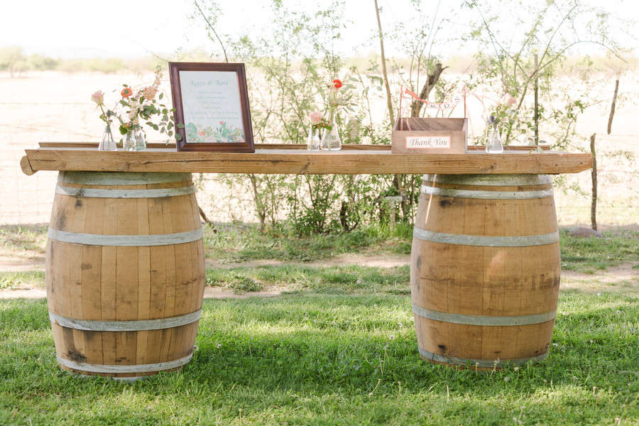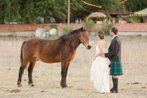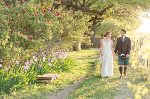 Q1: Tell us about your wedding! “We wanted to have a fun, carefree day with family and friends in a beautiful setting.” Q2: Let’s talk wedding decor “Our ceremony and reception were completely outside on a farm just south of Tucson. The large trees, gardens filled with blooming flowers, and charming hacienda created such a lovely setting, that we really didn’t need to add much. “We accented the space with coral and pink flowers along the aisle and on the tables. Ross and I are both scientists so we borrowed some lab beakers to use as vases. “We’re also both transplants to the Arizona and have a deep appreciation for the diversity of the environment here, so we used cacti in our signage and desert critters to identify tables rather than numbers. I made the cake and dessert trays and card box out of wood leftover from furniture projects.” Q3: Did you personalize the day in any way? “We incorporated many Scottish elements into the day. Ross and I were both piped down the aisle by a highland bagpiper. After our first dance Ross coached our family and friends through several Scottish group dances on the lawn. Although it was a bit chaotic, everyone was on their feet, smiling and laughing. It was really quite a highlight. “Ross’ mom baked the delicious cake, cupcakes and hedgehogs (chocolate desserts). “We really enjoyed our time after the ceremony getting photos together, because it was the one part of the day when Ross and I had a few moments alone (besides the photographers, of course) to reflect on the day and be little goofy together.” Q4: Let’s talk fashion “I was looking for a dress light enough for an April day in Tucson, and that moved beautifully. My dress from was simple and perfect for twirling. A beaded belt gave it just a bit of sparkle. For the ceremony I wore a delicate lace topper, which added a romantic touch. In addition to my wedding ring, I wore a pair of antique earrings with pearls, that Ross had given me one Christmas. I kept my makeup light and natural. My hair was pulled back into a side braid and bun that was soft, but also had a hint of warrior princess. “Ross looked quite dapper kilt, with a waistcoat and jacket. He was fully decked out with the traditional Scottish accessories: kilt pin, sporran (pouch), flashes, and the Sgian Dubh (knife). And according to traditional, he was a true Scotsman.” Q5: How did you meet? Tell us about the proposal. “Ross and I met the modern way, on the internet. On our first date we really hit it off, we had a great dinner and spent the rest of the evening talking while exploring the city on foot. “After six years together we took a trip to Belize. After snorkeling a barrier reef, paddle boarding and exploring Mayan ruins, we spent our last few days relaxing at a beautiful jungle resort. “Early in our stay, Ross snuck away to conspire with the resort staff on proposal plans. On our second to last day we returned to our casita, very sweaty from a morning kayaking, and the place was completely decorated with hibiscus and bougainvillea. There was a sweet letter from Ross. “After I finished reading it, he asked, and I said yes. We spent the rest of the day drinking champagne in a hammock.” Q6: Do you have any wedding planning or marriage advice that you’d like to share with other couples planning their day? “Focus on the aspects of the day that are important to you and your soon to be spouse.”Gallery