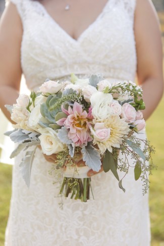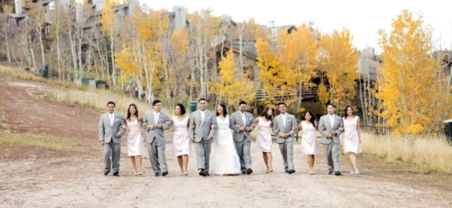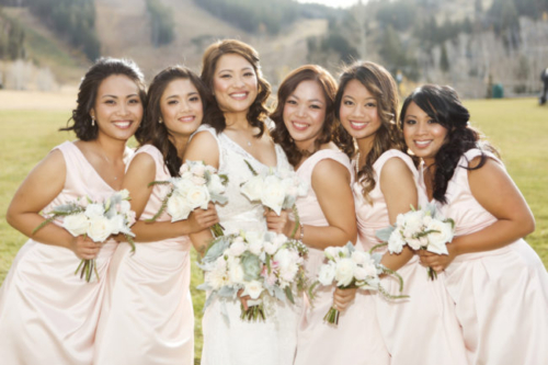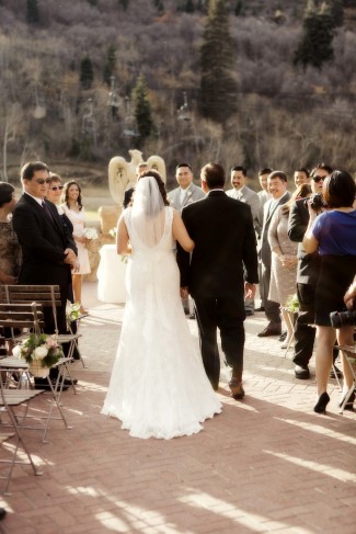 “My wedding inspiration came from my love of neutral colors and blush pink. I wanted a feeling of soft and calm, yet classy. Â I consulted with Artisan Bloom for their advice. A wrapped aspen wood flower arrangements with different heights of aspen wood trunks accented with pillar candles, succulents and votive candles, certainly gave the snow park lodge a very stylish rustic chic theme.”