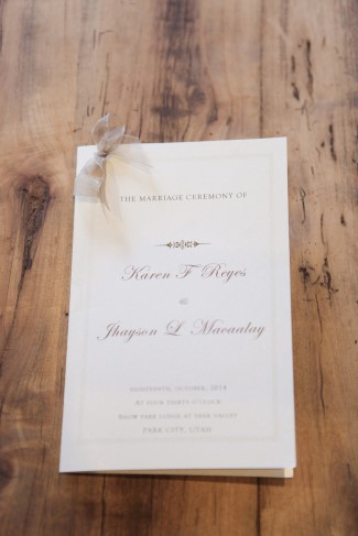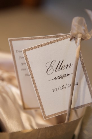 “I designed them myself using Microsoft publisher and then bought a high quality paper from wedding paper divas and put it all together. I embellished the wedding program with a light brown sheer ribbon from Michael’s arts & craft store. The hours designing, printing and embellishing was definitely fun and worth it.”