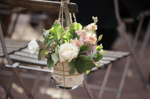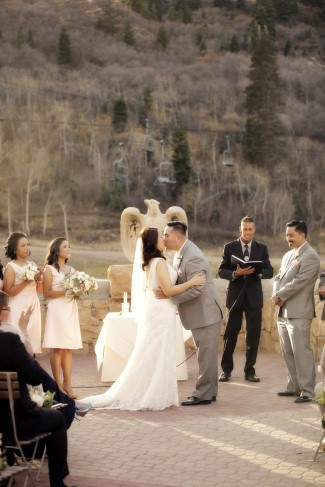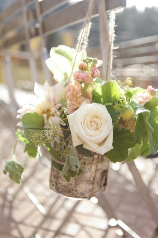 “With the natural beauty and stunning mountainous backdrop, I did not have to add a lot of decor to our wedding ceremony. My florist, Artisan Bloom, proposed light floral arrangements for the deck and aisle which were floral arrangement wrapped in aspen bark and suspended from the aisle chairs. They were very simple but rustic.”
