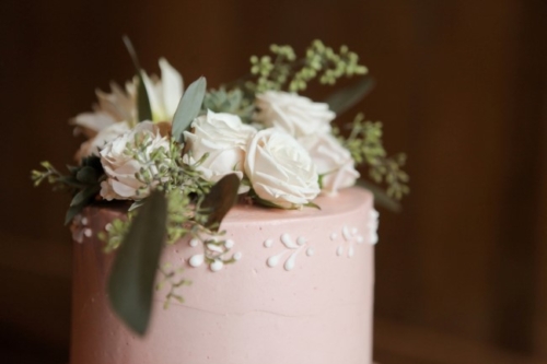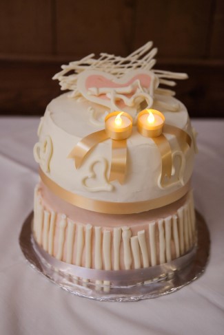 “Our wedding cake was a 4 level traditionally stacked rounds cake with dark petal buttercream frosting. Each tier of the cake was covered with ivory piped frosting with dots and lacey scrollwork; a very subtle design as to not overwhelm the cake. The cake was dressed with succulents, blush tea roses and some votive candles around it.”